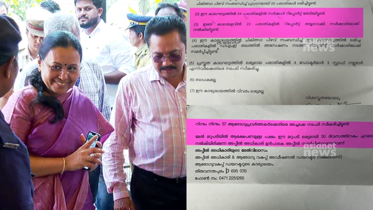 തിരുവനന്തപുരം: രണ്ടാം പിണറായി സർക്കാരിന്റെ കാലത്ത് ചികിത്സ പിഴവുകളിൽ ആരോഗ്യമന്ത്രി തേടിയത് ഒരു ലോഡ് റിപ്പോർട്ടുകൾ. 43 തവണ ആരോഗ്യമന്ത്രി റിപ്പോർട്ട് തേടിയെന്നാണ് വിവരാവകാശ നിയമ പ്രകാരം ഏഷ്യാനെറ്റ് ന്യൂസിന് കിട്ടിയ മറുപടി. ചികിത്സ പിഴവ് പരാതികൾ കുമിഞ്ഞുകുടൂമ്പോഴും ലഭിച്ച ആകെ പരാതികളുടെ കണക്കും, സ്വീകരിച്ച നടപടികളും ക്രോഡീകരിച്ച് സൂക്ഷിച്ചിട്ടില്ലെന്നും ആരോഗ്യവകുപ്പ് സമ്മതിക്കുന്നു. തുടർചികിത്സയിലും സഹായധനത്തിലും കണക്കില്ല.