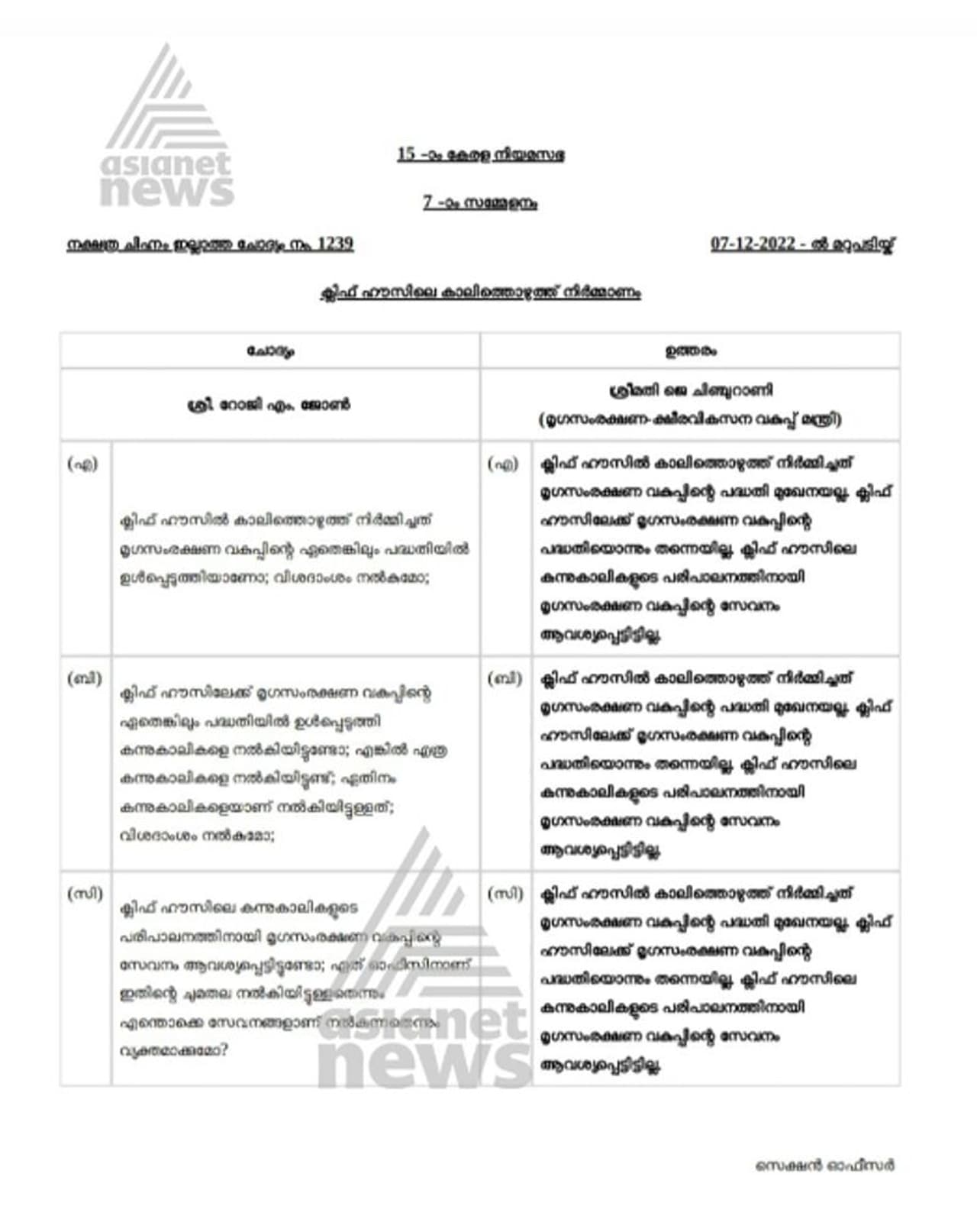 എല്ലാ ചോദ്യത്തിനുമായി ഒറ്റ മറുപടിയാണ് മൃഗസംരക്ഷണ വകുപ്പ് മന്ത്രി ജെ ചിഞ്ചുറാണി നല്കിയിരിക്കുന്നത്. ക്ലിഫ് ഹൗസില് കാലിത്തൊഴുത്ത് നിര്മ്മിച്ചത് മൃഗസംരക്ഷണ വകുപ്പിന്റെ പദ്ധതി മുഖേനയല്ല. ക്ലിഫ് ഹൗസിലേക്ക് മൃഗസംരക്ഷണ വകുപ്പിന്റെ പദ്ധതിയൊന്നും തന്നെയില്ല. ക്ലിഫ് ഹൗസിലെ കന്നുകാലികളുടെ പരിപാലനത്തിനായി മൃഗസംരക്ഷണ വകുപ്പിന്റെ സേവനം ആവശ്യപ്പെട്ടിട്ടില്ല. എന്നിങ്ങനെയായിരുന്നു മന്ത്രി ജെ ചിഞ്ചുറാണിയുടെ മറുപടി. ചീഫ് എൻജിനീയർ നൽകിയ എസ്റ്റിമേറ്റ് പരിശോധിച്ചായിരുന്നു പൊതുമരാമത്ത് വകുപ്പ് ക്ലിഫ് ഹൗസില് പുതിയ കാലിത്തൊഴുത്തും ചുറ്റുമതിലും നിര്മ്മിക്കാന് പണം അനുവദിച്ചത്. പൊതുമരാമത്ത് ചീഫ് എഞ്ചിനിയറുടെ വിശദമായ എസ്റ്റിമേറ്റിൽ 42. 90 ലക്ഷം രൂപയാണ് ക്ലിഫ് ഹൗസിലെ കേടുപാടുള്ള മതിലിനും പുതിയ പശു തൊഴുത്ത് പണിയുന്നതിനുമായി അനുവദിച്ചത്. 2018 ഡിഎസ്ആർ പ്രകാരമാണ് എസ്റ്റിമേറ്റ് കണക്കാക്കിയിരിക്കുന്നത്.