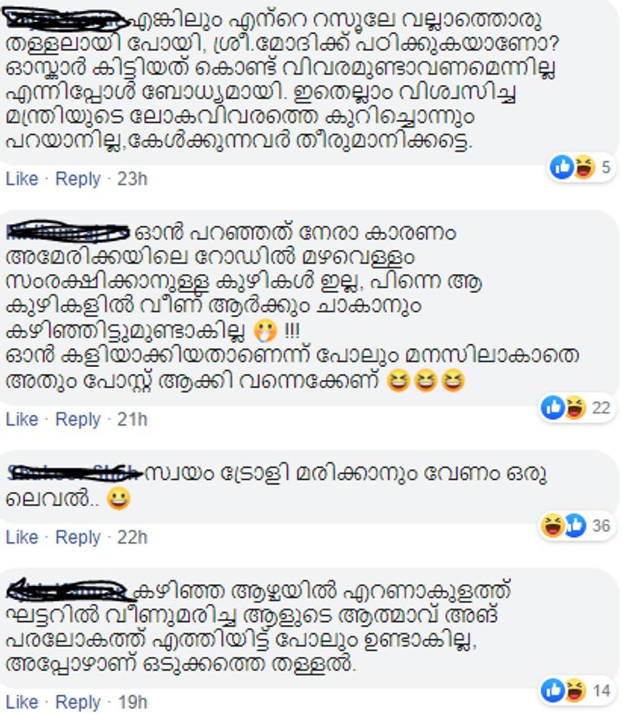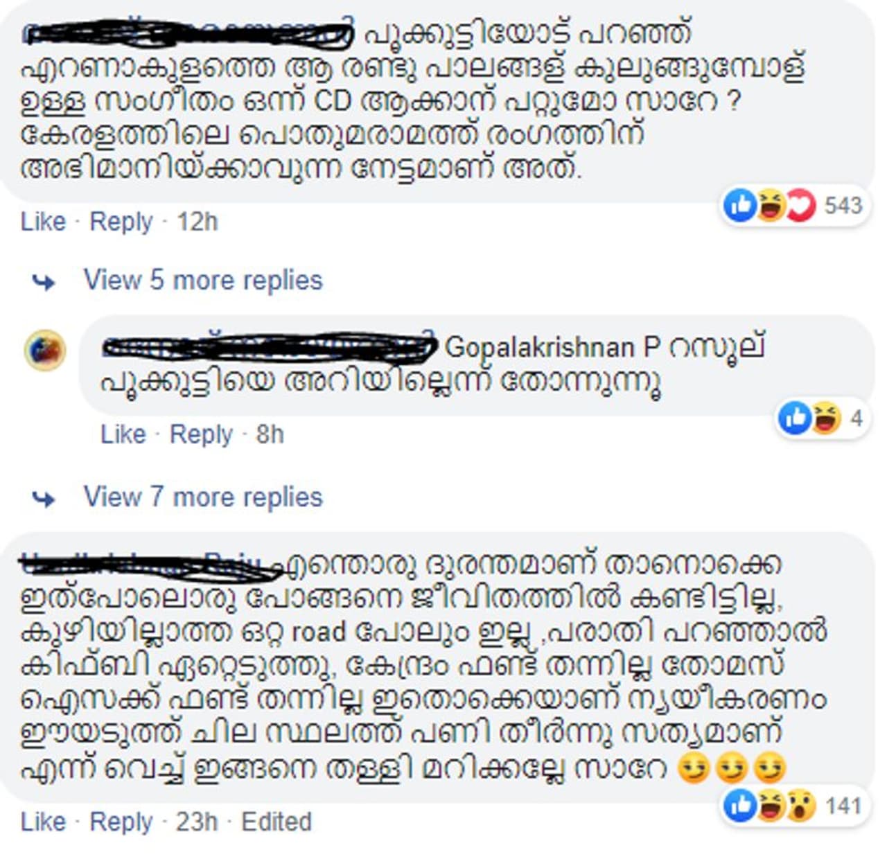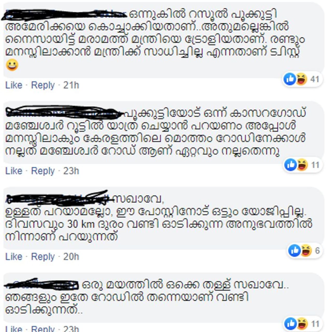 'അതിന് വിമാനത്തിൽ യാത്ര ചെയ്യുന്ന പൂക്കുട്ടിക്കെങ്ങനെ കേരളത്തിലെ റോഡിന്റെ അവസ്ഥ അറിയാൻ കഴിയും' എന്നാണ് മറ്റുചിലർ കമന്റിട്ടിരിക്കുന്നത്. അമേരിക്കയെ കൊച്ചാക്കിയതാണോ മന്ത്രിയെ നൈസ് ആയി ട്രോളിയതാണോ എന്ന് വ്യക്തമാക്കണമെന്നും ചിലർ പറയുന്നുണ്ട്.