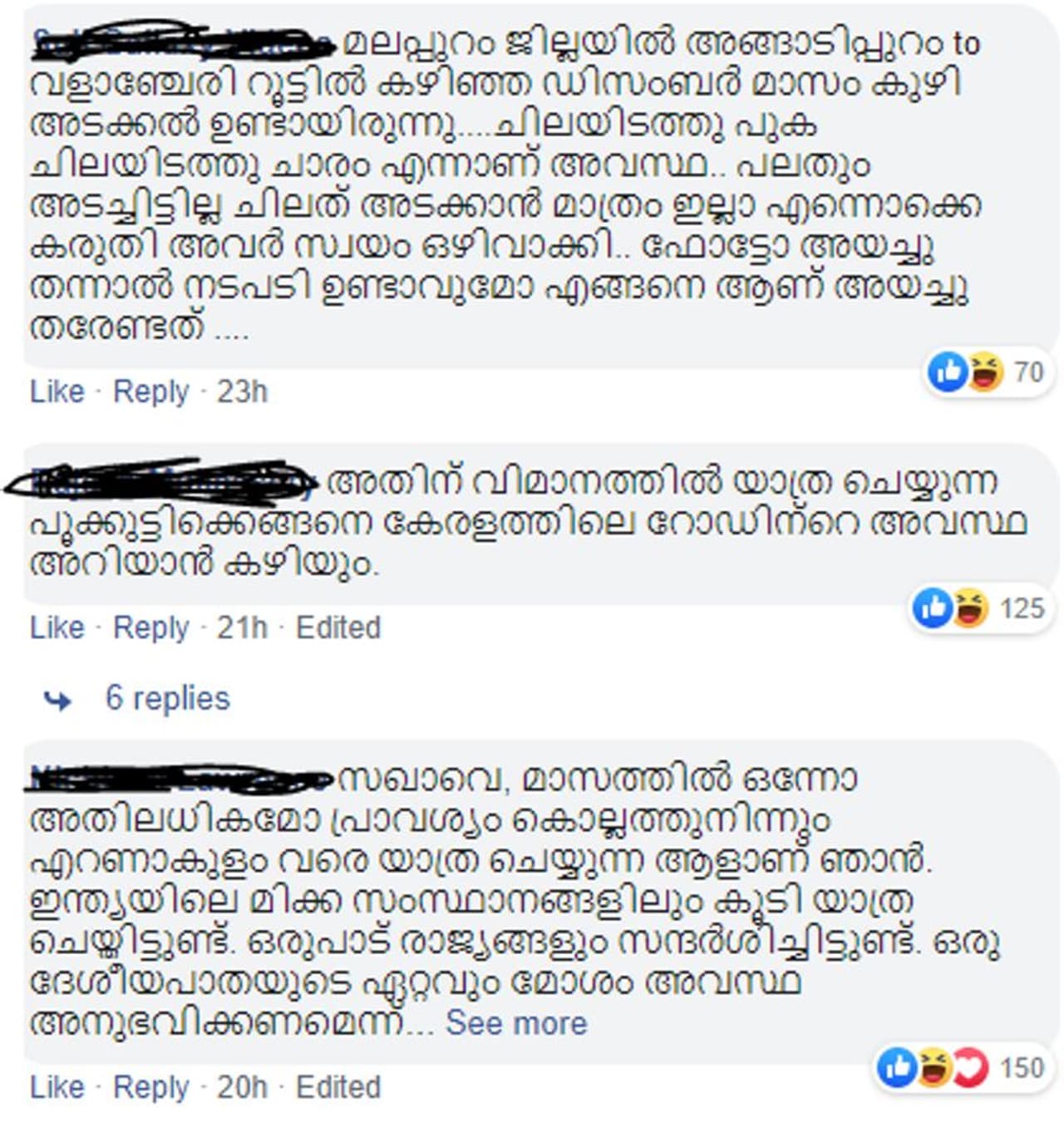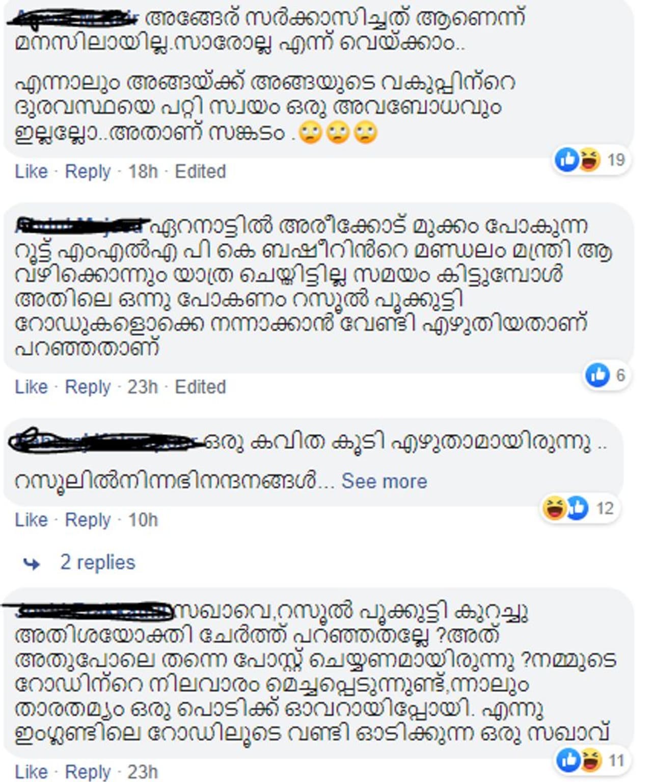 ഈ പോസ്റ്റിന് താഴേയാണ് സൈബർ ഉപഭോക്താക്കൾ വിമർശനവും പരിഹാസവുമായി രംഗത്തെത്തിയിരിക്കുന്നത്. 'ഒരു മയത്തിൽ ഒക്കെ തള്ള് സഖാവേ.. ഞങ്ങളും ഇതേ റോഡിൽ തന്നെയാണ് വണ്ടി ഓടിക്കുന്നത്..' എന്നിങ്ങനെയാണ് കമന്റുകൾ. വിവിധ ഇടങ്ങളിലെ പൊളിഞ്ഞു കിടക്കുന്ന റോഡുകളിലേക് പലരും മന്ത്രിയെയും പൂക്കുട്ടിയെയും സ്വാഗതം ചെയ്യുകയും ചെയ്യുന്നുന്നുണ്ട്.