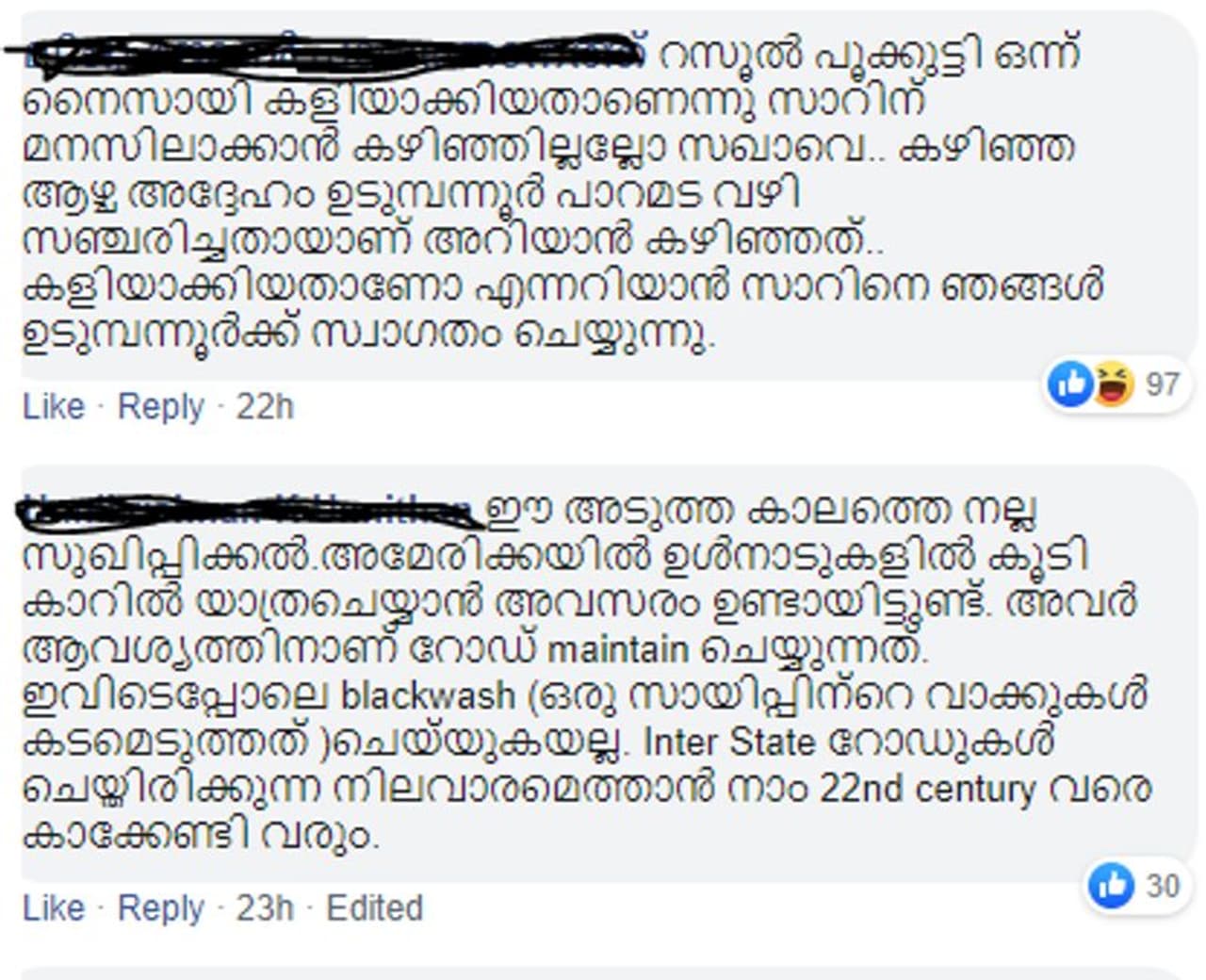 'അതിന് വിമാനത്തിൽ യാത്ര ചെയ്യുന്ന പൂക്കുട്ടിക്കെങ്ങനെ കേരളത്തിലെ റോഡിന്റെ അവസ്ഥ അറിയാൻ കഴിയും' എന്നാണ് മറ്റുചിലർ കമന്റിട്ടിരിക്കുന്നത്. അമേരിക്കയെ കൊച്ചാക്കിയതാണോ മന്ത്രിയെ നൈസ് ആയി ട്രോളിയതാണോ എന്ന് വ്യക്തമാക്കണമെന്നും ചിലർ പറയുന്നുണ്ട്. ഒപ്പം പൊളിഞ്ഞ റോഡുകളുടെ നീണ്ട ലിസ്റ്റ് തന്നെ പോസ്റ്റിന് താഴേ ആളുകൾ നിരത്തിയിട്ടുണ്ട്.