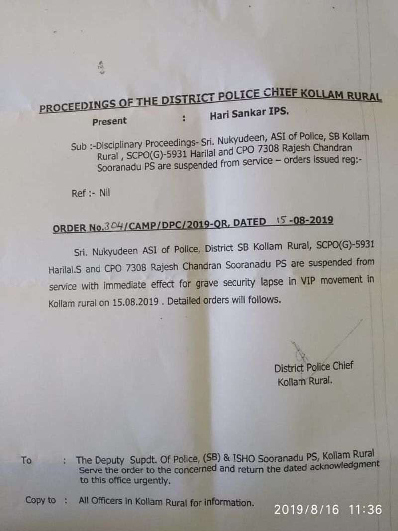 ശൂരനാട് പോലീസ് സ്റ്റേഷനിലെ സീനിയര് സിപിഒ ഹരിലാല്, സിപിഒ രാജേഷ്, റൂറല് പോലീസ് സ്പെഷല് ബ്രാഞ്ചിലെ എഎസ്ഐ നുക്യുദീന് എന്നിവരെ ഗുരുതര സുരക്ഷാ വീഴ്ച ആരോപിച്ചാണ് എസ്പി സസ്പെന്ഡ് ചെയ്തത്. വാഹനം കടന്നുപോകുന്ന കാര്യം മുൻകൂട്ടി അറിയിച്ചിട്ടും വേണ്ട സൗകര്യം ഒരുക്കിയില്ലെന്ന് കണ്ടെത്തിയാണ് നടപടിയെന്നാണ് ഔദ്യോഗിക വിശദീകരണം.