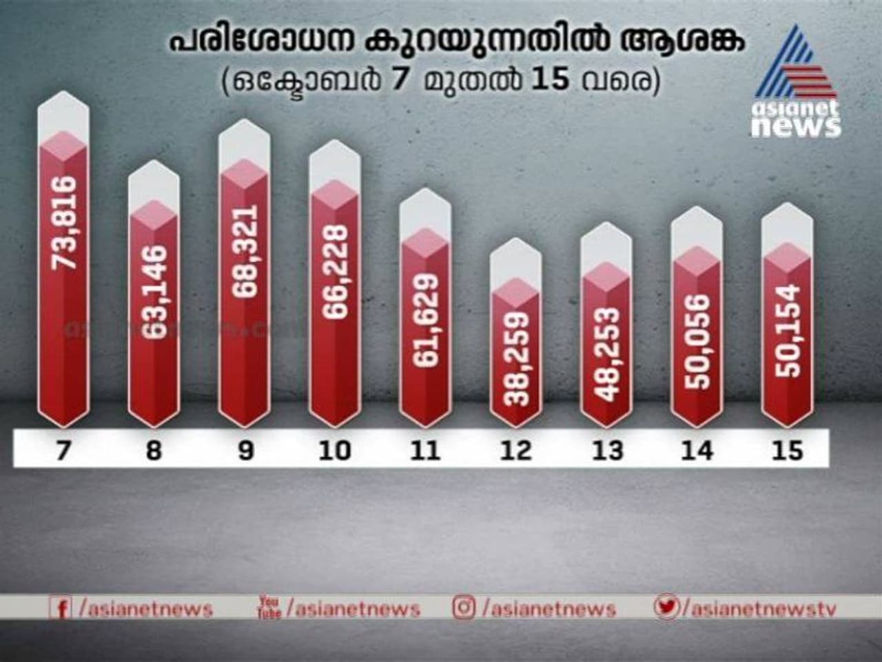തിരുവനന്തപുരം: സംസ്ഥാനത്ത് പ്രതിദിനകൊവിഡ് രോഗികളുടെ എണ്ണം കുറയുന്നു. എന്നാൽ അതേ സമയം കൊവിഡ് ടെസ്റ്റുകളുടെ എണ്ണവും കുറയുന്നുവെന്നാണ് കണക്കുകൾ വ്യക്തമാക്കുന്നത്. കഴിഞ്ഞ ആഴ്ചകളിൽ 73,000 വരെ പ്രതിദിന കൊവിഡ് ടെസ്റ്റുകൾ നടന്നിടത്ത് ഇപ്പോൾ 50,000 ത്തോളം ടെസ്റ്റുകൾ മാത്രമാണ് നടക്കുന്നത്. രോഗവ്യാപനതോത് അറിയാൻ ടെസ്റ്റുകൾ നിർണായകമാണെന്നിരിക്കെ ടെസ്റ്റുകളുടെ എണ്ണം കുറയുന്നതിനെതിരെ പ്രതിഷേധം ഉയരുന്നുണ്ട്.