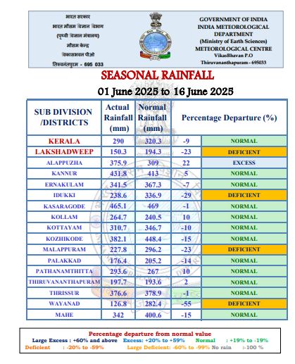 വയനാട് 55 ശതമാനം മഴക്കുറവുണ്ടായി. 282.4 മിമീ മഴ ലഭിക്കേണ്ട സ്ഥാനത്ത് വെറും 126.8 മിമീ മഴ മാത്രമാണ് ലഭിച്ചത്. മലപ്പുറത്ത് 23 ശതമാനവും ഇടുക്കിയിൽ 29 ശതമാനവും മഴ കുറഞ്ഞു. അതേസമയം, 309 മിമീ പെയ്യേണ്ട ആലപ്പുഴയിൽ ഇതുവരെ 375.9 മിമീ മഴ പെയ്തു. ഇറിഗേഷൻ വകുപ്പിന്റെ കണക്കനുസരിച്ച് മെയ് 24 മുതൽ ജൂൺ 16വരെ കേരളത്തിൽ 861.6 മില്ലി മീറ്റർ മഴ ലഭിച്ചു. 1335.9 മിമീ ലഭിച്ച കാസർകോടാണ് മുന്നിൽ.