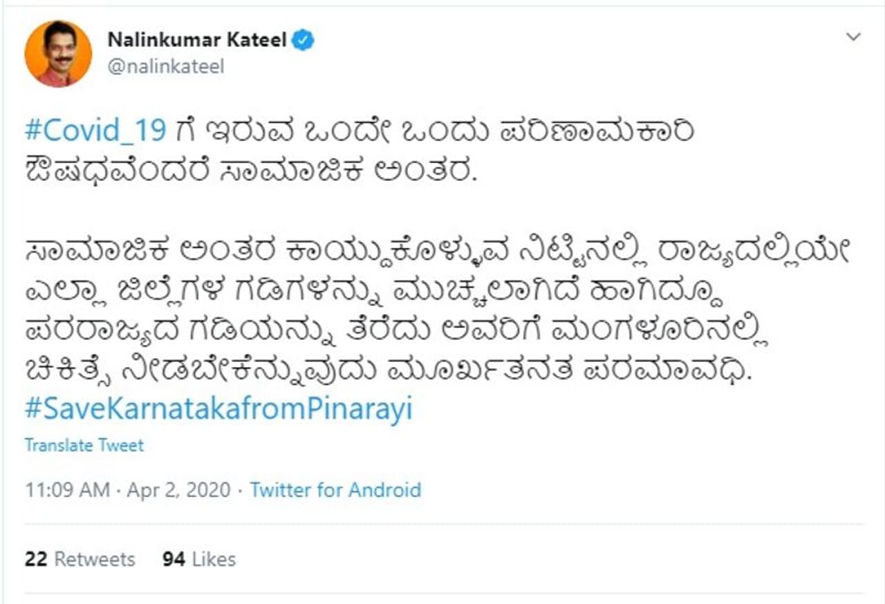 കാസർകോട്: കർണാടക അതിർത്തി തുറക്കില്ലെന്ന് ദക്ഷിണ കന്നഡ എംപിയും ബിജെപി സംസ്ഥാന അധ്യക്ഷനുമായ നളിൻ കുമാർ കട്ടീൽ. അതിർത്തി തുറന്നാൽ കർണാടകം വലിയ വില കൊടുക്കേണ്ടിവരും. കേരളത്തിലെ രോഗികൾക്ക് ആവശ്യമായ സൗകര്യം പിണറായി വിജയൻ കാസർകോട് തന്നെ ഒരുക്കണമെന്നും നളിൻ കുമാർ കട്ടീൽ പറഞ്ഞു.