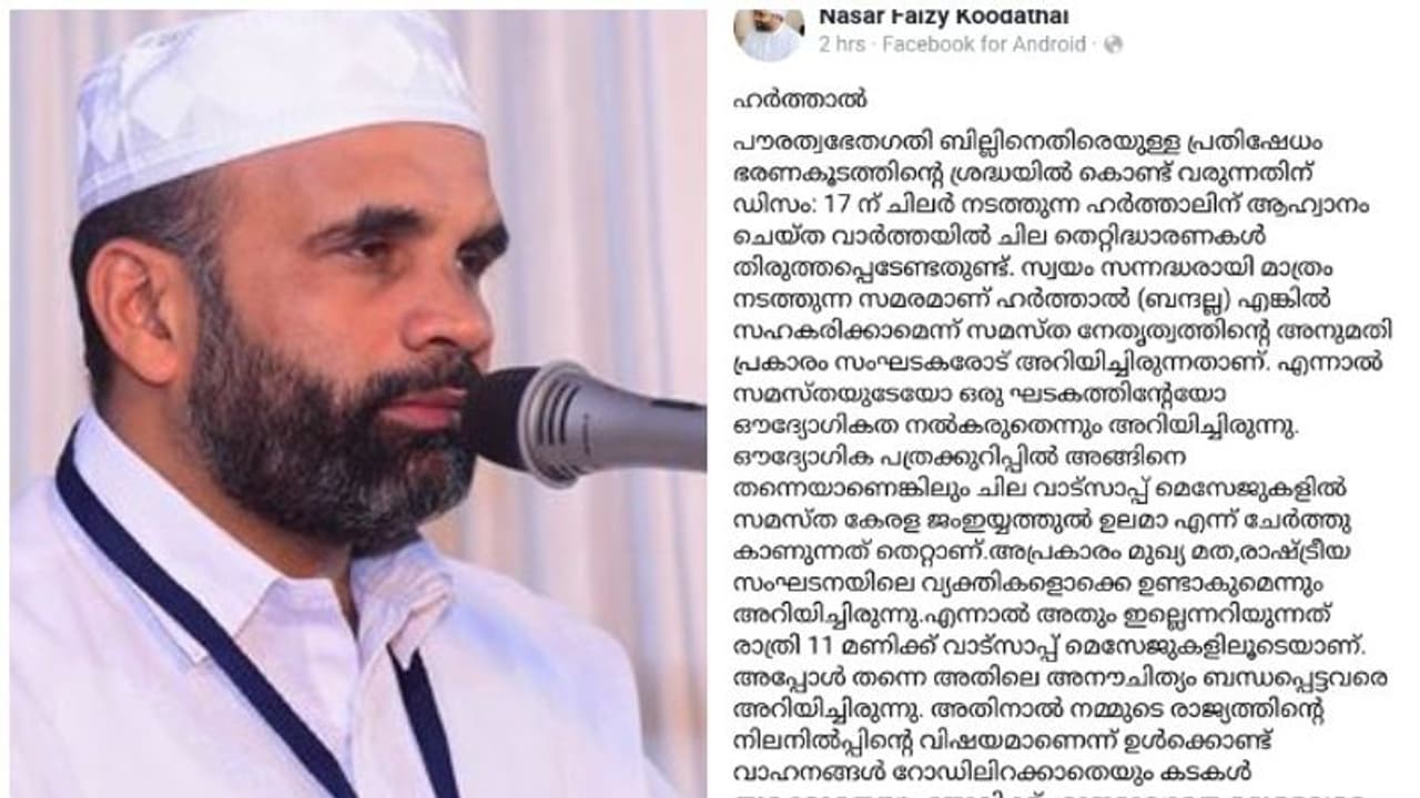 ഹർത്താൽ നടത്തുന്നത് സംഘടനയുടെ ഔദ്യോഗിക നിർദേശ പ്രകാരമല്ല. സ്വയം സന്നദ്ധമാകുന്ന സമരത്തോട് യോജിക്കുമെന്നും നാസർ ഫൈസി കൂടത്തായി ഫേസ് ബുക്ക് പോസ്റ്റിൽ പ്രതികരിച്ചു.
