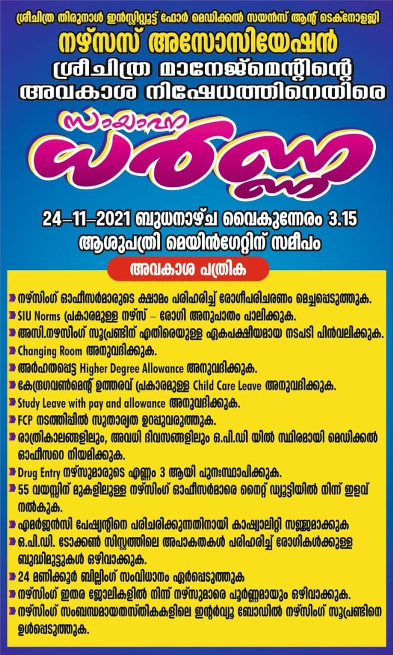 തിരുവനന്തപുരം: ശ്രീചിത്ര മാനേജ്മെന്റിനെതിരെ (Sri Chithra management) നാളെ നഴ്സസ് അസോസിയേഷന്റെ (Nurses association) നേതൃത്വത്തില് ധര്ണ. വൈകീട്ട് മൂന്നേ കാലിന് ആശുപത്രി പ്രധാന ഗേറ്റിലാണ് സമരം. 16ഓളം അവകാശങ്ങള് ഉന്നയിച്ചാണ് സംഘടന സമരം നടത്തുന്നത്. നഴ്സിങ് ഓഫിസര്മാരുടെ ക്ഷാമം പരിഹരിച്ച് രോഗീപരിചരണം മെച്ചപ്പെടുത്തുക, ചട്ടപ്രകാരമുള്ള നഴ്സ്-രോഗി അനുപാതം പാലിക്കുക, അസി. നഴ്സിങ് സൂപ്രണ്ടിനെതിരെയുള്ള ഏകപക്ഷീയ നടപടി പിന്വലിക്കുക, ചേഞ്ചിംഗ് റൂം അനുവദിക്കുക, നിയമപ്രകാരമുള്ള ചൈല്ഡ് കെയര് ലീവ് അനുവദിക്കുക, ശമ്പളത്തോടെയുള്ള സ്റ്റഡീ ലീവ് അനുവദിക്കുക, ഹയര് ഡിഗ്രി അലവന്സ് അനുവദിക്കുക തുടങ്ങിയ ആവശ്യങ്ങളാണ് മുന്നോട്ടുവെച്ചിരിക്കുന്നത്.