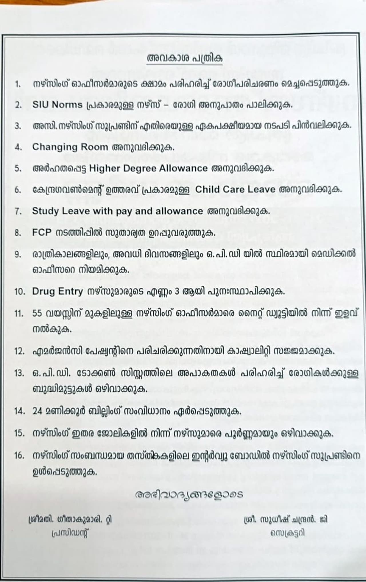 വൈകീട്ട് മൂന്നേ കാലിന് ആശുപത്രി പ്രധാന ഗേറ്റിലാണ് സമരം. 16ഓളം അവകാശങ്ങള് ഉന്നയിച്ചാണ് സംഘടന സമരം നടത്തുന്നത്.