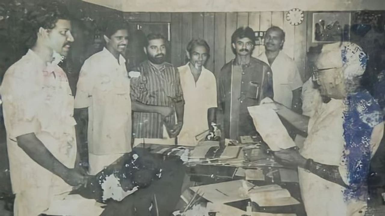 സെക്രട്ടറിയറ്റിലെ ഓഫീസിൽ വച്ച് അന്നത്തെ മുഖ്യമന്ത്രി കെ.കരുണാകരനെയാണ് ഏതാനും ലക്ഷങ്ങൾ വരുന്ന തുക ഏൽപ്പിച്ചത്. എസ്.ശർമ്മ,കടകംപള്ളി സുരേന്ദ്രൻ, മുത്തു എന്നിവരാണ് കൂടെയുള്ളത്.മുഖ്യമന്ത്രിയുടെ മറയിൽ നിൽക്കുന്നത് മന്ത്രിയും യൂത്ത് കോൺഗ്രസ് പ്രസിഡൻ്റുമായിരുന്ന പന്തളം സുധാകരനാണ്.