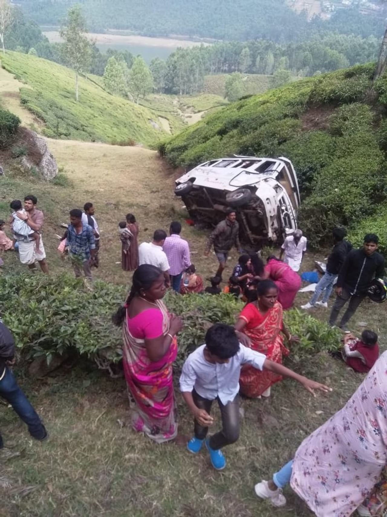 നിയന്ത്രണം നഷ്ടപ്പെട്ട വാൻ വഴിയിൽ നിന്ന് റോഡില് നിന്നും കുത്തനെ താഴെയുള്ള തേയില തോട്ടത്തിലേക്ക് പതിക്കുകയായിരുന്നുവെന്ന് ദൃക്സാക്ഷികള് പറയുന്നു. ഡ്രൈവർ അടക്കം 17 പേരും 8 കുട്ടികളുമാണ് വാഹനത്തിൽ ഉണ്ടായിരുന്നത്. കുട്ടികൾക്കടക്കം എല്ലാവർക്കും പരിക്കേറ്റിട്ടുണ്ട്. ആരുടേയും നില ഗുരുതരമല്ല.