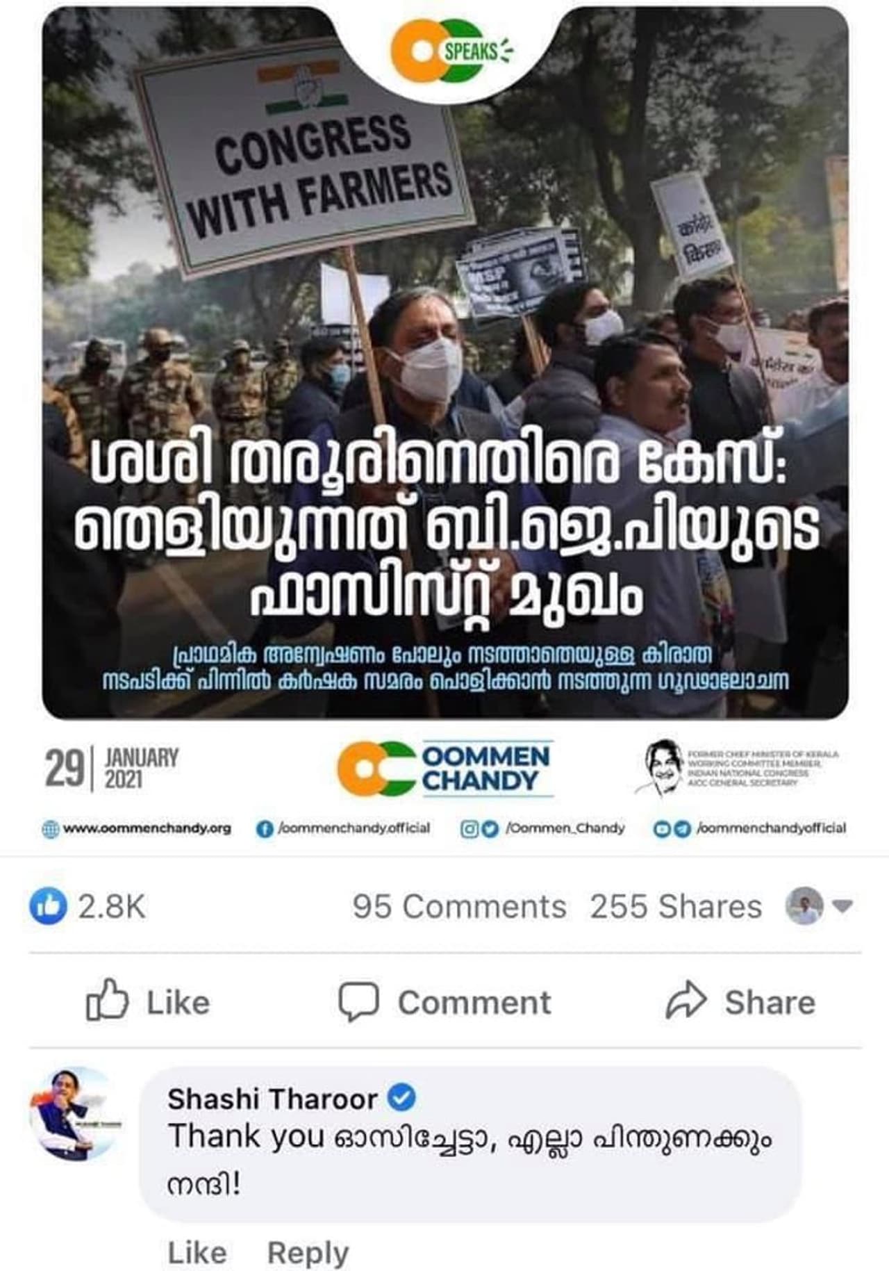 തിരുവനന്തപുരം: കര്ഷകരുടെ ട്രാക്ടർ റാലിയുമായി ബന്ധപ്പെട്ട് സാമൂഹിക മാധ്യമങ്ങളിലെ പോസ്റ്റുകൾക്കെതിരെ ലഭിച്ച പരാതിയില് കോണ്ഗ്രസ് നേതാവ് ശശി തരൂരിനെതിരെ രാജ്യദ്രോഹ കേസെടുത്ത സംഭവത്തില് തരൂരിന് പിന്തുണയുമായി ഉമ്മന്ചാണ്ടി. ശശി തരൂരിനെതിരെ യു.എ.പി.എ ചുമത്തി രാജ്യദ്രോഹ കേസെടുത്തതിലൂടെ ബി.ജെ.പിയുടെ ഫാസിസ്റ്റ് മുഖമാണ് വ്യക്തമായതെന്ന് ഉമ്മന്ചാണ്ടി പറഞ്ഞു.