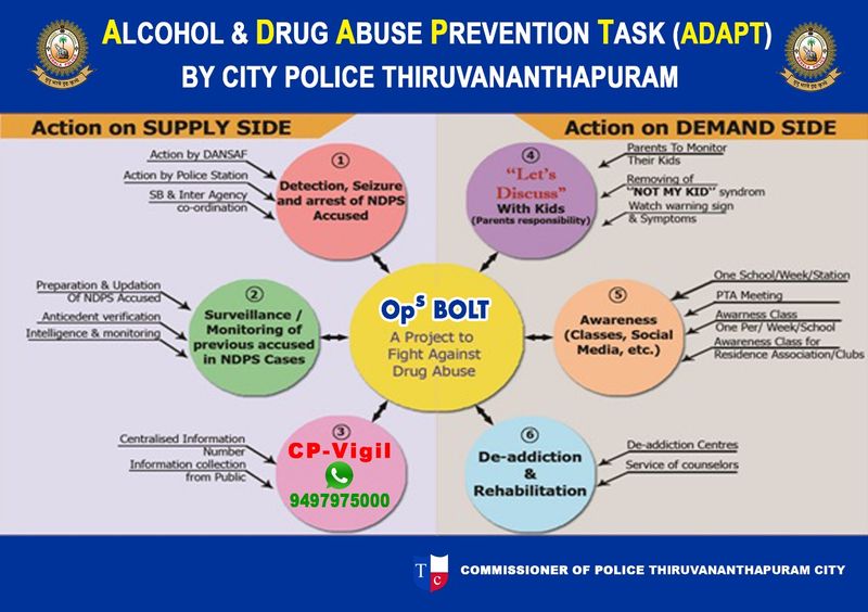 ലഹരിക്ക് അടിമപ്പെട്ടവരെ അതില്നിന്ന് മുക്തരാക്കുന്നതിനും പുനരധിവസിപ്പിക്കുന്നതിനും ലഹരിവിമുക്തകേന്ദ്രങ്ങളെ ഉപയോഗപ്പെടുത്തുകയും കൗണ്സിലിംഗ് നല്കുകയും ചെയ്യും. ഇത്തരത്തില് വിശാലമായ പദ്ധതിയാണ് തിരുവനന്തപുരം സിറ്റി പൊലീസ് ലഹരി ഉപയോഗത്തെ തുടര്ന്നുള്ള അക്രമ സംഭവങ്ങള് തുടച്ചു നീക്കുന്നതിനായി വിഭാവനം ചെയ്തിരിക്കുന്നത്.