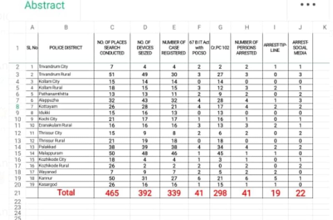 കഴിഞ്ഞ രണ്ട് വർഷങ്ങൾക്കുള്ളിൽ നടന്ന റെയ്ഡുകളിൽ ആകെ 525 കേസുകളാണ് റജിസ്റ്റർ ചെയ്തത്. രണ്ട് വർഷത്തിനിടെ 428 പേരെ അറസ്റ്റ് ചെയ്തു. ആകെ അറസ്റ്റിലായവരിൽ ഐടി രംഗത്തുള്ളവരും പ്രൊഫഷണലുകളുമുണ്ടെന്ന് പൊലീസ് വ്യക്തമാക്കുന്നു. പത്തനംതിട്ടയിൽ ഡോക്ടർ അടക്കമുള്ളവർ അറസ്റ്റിലായി. എഡിജിപി മനോജ് എബ്രഹാമിന്റെ നേതൃത്വത്തിലാണ് റെയ്ഡുകൾ നടന്നത്.