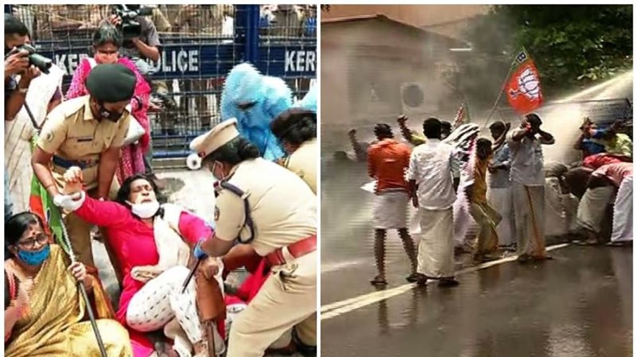 തിരുവനന്തപുരത്തെ സെക്രട്ടേറിയറ്റിന് മുന്നിൽ യുവമോർച്ച പ്രതിഷേധവും അക്രമാസക്തമായി. പ്രതിഷേധക്കാര് ബാരിക്കേഡുകൾ തള്ളി മാറ്റാൻ ശ്രമിച്ചു. പൊലീസ് ഗ്രനേഡ് പ്രയോഗിച്ചു. സെക്രട്ടേറിയറ്റിന് മുന്നിൽ മഹിളാ കോൺഗ്രസ് പ്രവര്ത്തകരും മുഖ്യമന്ത്രിയുടെ കോലം കത്തിച്ചു.