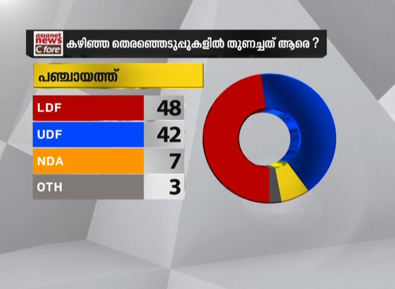 കഴിഞ്ഞ തെരഞ്ഞെടുപ്പിൽ ചിന്തിച്ചതെങ്ങനെ എന്ന ചോദ്യത്തിന് ഉത്തരം തേടിയപ്പോൾ മാനദണ്ഡമാക്കിയത് ഏറ്റവും ഒടുവിൽ നടന്ന പഞ്ചായത്ത് നിയമസഭ ലോക് സഭാ തെരഞ്ഞെടുപ്പുകളാണ്. ഏറ്റവും അവസാനം നടന്ന തദ്ദേശ ഭരണ തെരഞ്ഞെടുപ്പിൽ സര്വെയിൽ പങ്കെടുത്ത 48 ശതമാനം പേര് പിന്തുണച്ചത് എൽഡിഎഫിനെ ആണ്. 42 ശതമാനം പേര് യുഡിഎഫിനും 7 ശതമാനം പേര് എൻഡിഎക്കും 3 ശതമാനം ആളുകൾ മറ്റുള്ളവരെയും പിന്തുണച്ചവരാണ്.