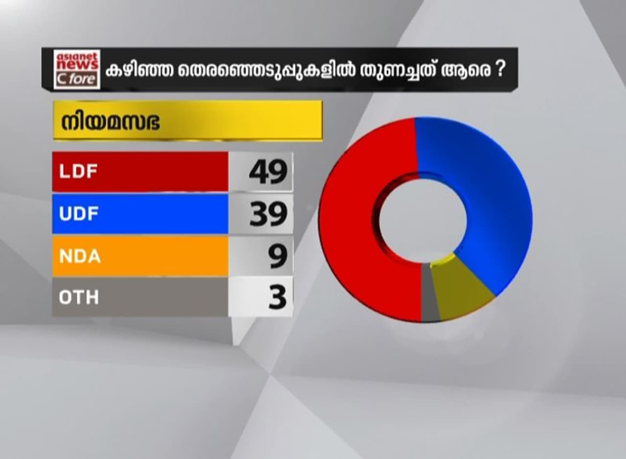 നിയമസഭാ തെരഞ്ഞെടുപ്പിൽ എൽഡിഎഫ് 49 ഉം യുഡിഎഫ് 39 ഉം എൻഡിഎ 9 ഉം മറ്റുള്ളവര് 3 ഉം ശതമാനം പിന്തുണ നേടിയിട്ടുണ്ടെന്നാണ് സര്വെ കണക്ക്. ലോക് സഭാ തെരഞ്ഞെടുപ്പിൽ എൽഡിഎഫ് 35 ശതമാനത്തിലേക്ക് ഒതുങ്ങിയപ്പോൾ യുഡിഎഫ് 50 ശതമാനം പേരുടെ പിന്തുണ ഉറപ്പിച്ചു. എൻഡിഎ 12 ശതമാനം പേരുടെ പിന്തുണയും മറ്റുള്ളവര് 3 ശതമാനം പേരുടെ വോട്ടും നേടിയിട്ടുണ്ട്.
