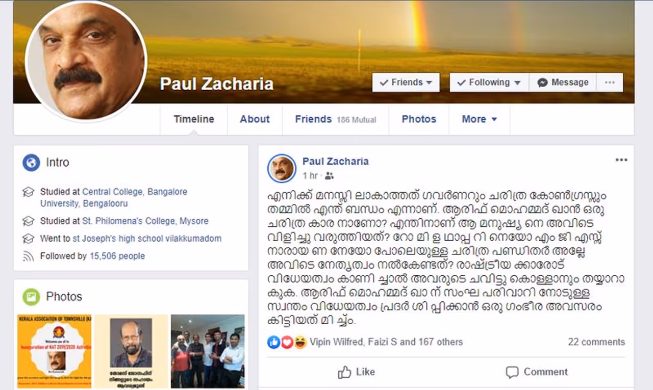 ഗവര്ണറെ ചരിത്ര കോൺഗ്രസിലേക്ക് വിളിച്ചുവരുത്തിയത് എന്തിനാണെന്ന് സക്കറിയ ആരിഫ് മൊഹമ്മദ് ഖാന് സംഘപരിവാറിനോടുള്ള വിധേയത്വം പ്രദർശിപ്പിക്കാൻ അവസരം കിട്ടിയെന്നും സക്കറിയ