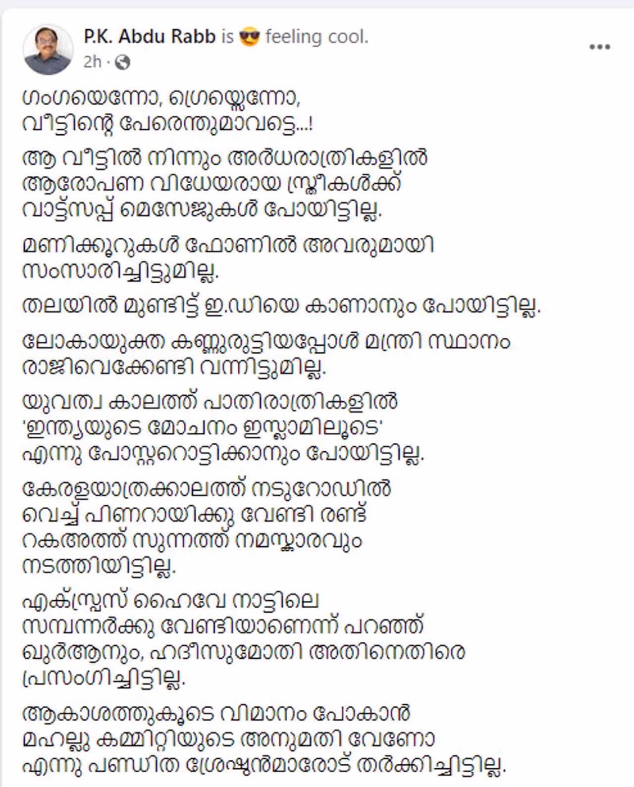 തിങ്കളാഴ്ച വൈകുന്നേരം പി കെ അബ്ദുറബ്ബ് ഒരു പോസ്റ്റിട്ടു. നേരിട്ട് ജലീലിനെ കടന്നാക്രമിക്കുന്ന പോസ്റ്റില് പ്രതിപക്ഷം ജലീലിനെതിരെ ആരോപിച്ചതും, ജലീലിന്റെ രാജിയിലേക്ക് നയിച്ചതുമായ കാര്യങ്ങള് എണ്ണിയെണ്ണി പറയുകയാണ്. രണ്ട് മണിക്കൂറിനിടെ 13,000ത്തോളം റീയക്ഷനുകളാണ് റബ്ബിന്റെ പോസ്റ്റിന് ലഭിച്ചിരിക്കുന്നത്.