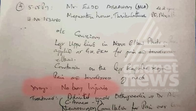 കൊച്ചി: ലാത്തിച്ചാര്ജ്ജിനിടെ പൊലീസ് കൈ തല്ലിയൊടിച്ചെന്ന എൽദോ എബ്രഹാം എംഎൽഎയുടെ ആരോപണം പൊളിയുന്നു. ആരോപണം വ്യാജമാമെന്ന പൊലീസ് വാദത്തിന് പിന്നാലെ എംഎൽഎയുടെ കൈക്ക് പൊട്ടലില്ലെന്നാണ് മെഡിക്കൽ റിപ്പോര്ട്ടും വ്യക്തമാക്കുന്നു. എംഎൽഎയുടെ കയ്യിലെ എല്ലുകൾക്ക് ഒരു കുഴപ്പവുമില്ലെന്ന് എറണാകുളത്തെ സ്വകാര്യ ആശുപത്രിയുടെ മെഡിക്കൽ റിപ്പോർട്ട് വ്യക്തമായി പറയുന്നു. അന്വേഷണത്തിന്റെ ഭാഗമായി ഈ റിപ്പോർട്ട് തഹസിൽദാർ ജില്ലാ കളക്ടർക്ക് കൈമാറി. മെഡിക്കല് റിപ്പോര്ട്ടിന്റെ പകര്പ്പ് ഏഷ്യാനെറ്റ് ന്യൂസിന് ലഭിച്ചു.
