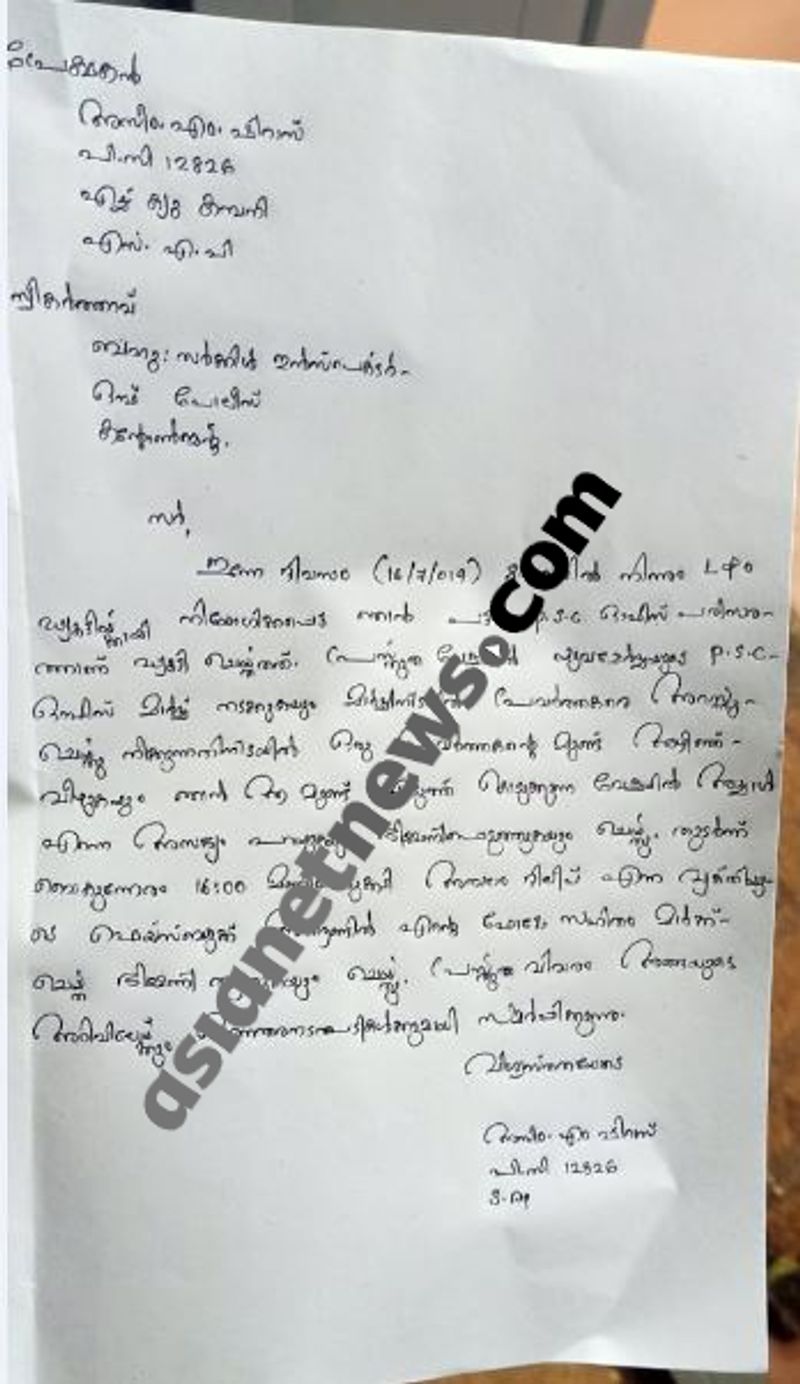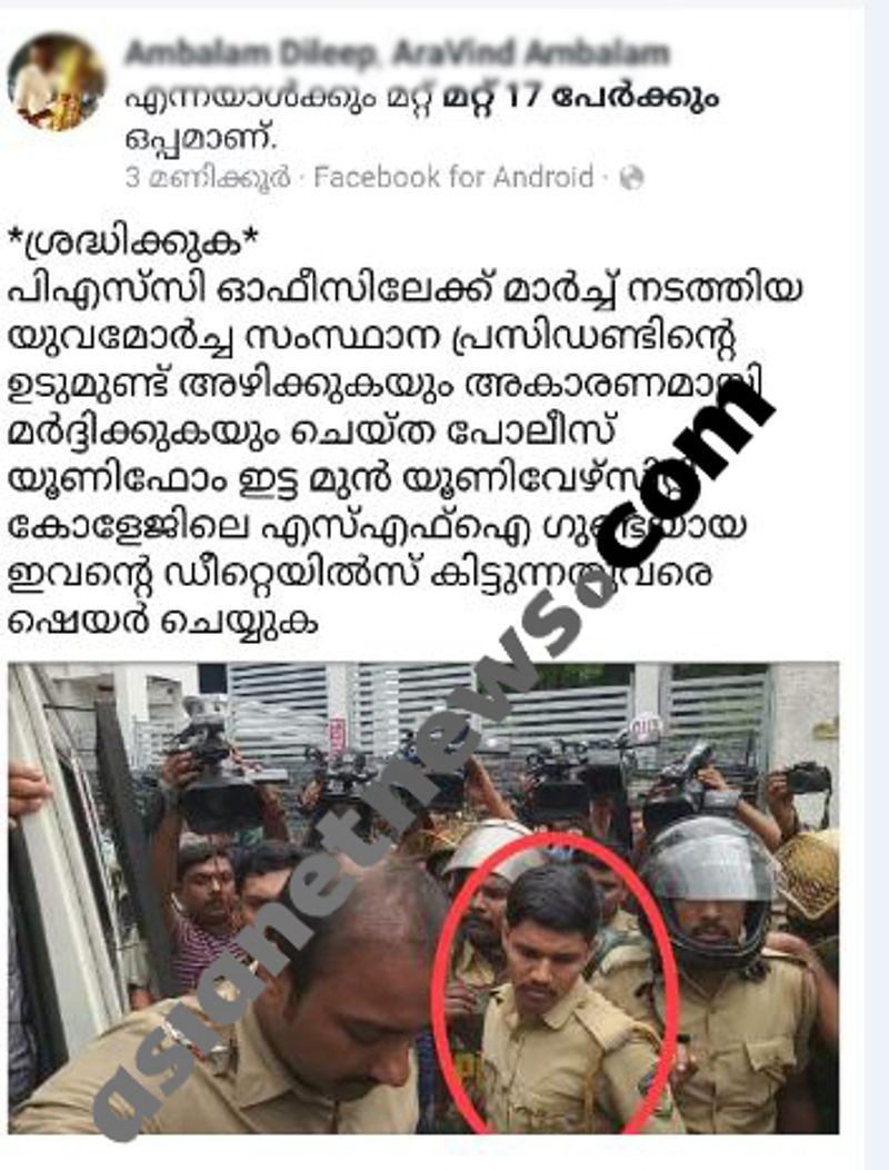 ''ശ്രദ്ധിക്കുക, പിഎസ്സി ഓഫീസിലേക്ക് മാര്ച്ച് നടത്തിയ യുവമോര്ച്ച സംസ്ഥാന പ്രസിഡന്റിന്റെ ഉടുമുണ്ട് അഴിക്കുകയും അകാരണമായി മര്ദ്ദിക്കുകയും ചെയ്ത പൊലീസ് യൂണിഫോമിട്ട മുന് യൂണിവേഴ്സിറ്റി ഗുണ്ടയായ ഇവന്റെ ഡീറ്റയില്സ് കിട്ടും വരെ ഷെയര് ചെയ്യുക'' എന്നായിരുന്നു പോസ്റ്റ്.