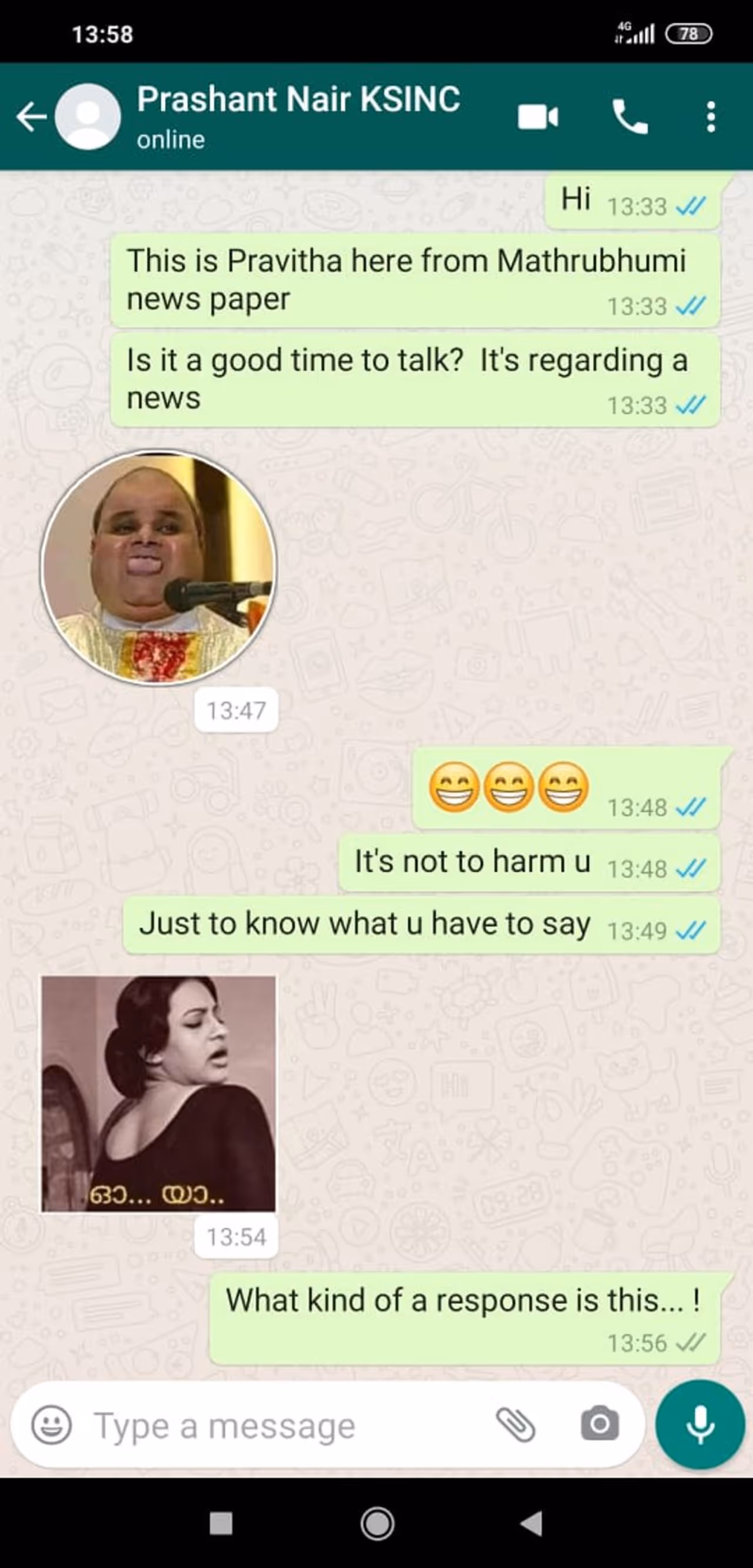 എന്തടിസ്ഥാനത്തിലാണ് ഔദ്യോഗിക പ്രതികരണം തേടുമ്പോൾ ഇത്തരം മോശം സ്റ്റിക്കറുകൾ അയക്കുന്നതെന്ന് ചോദിച്ചപ്പോൾ, അതുവരെ അയച്ച സ്റ്റിക്കറുകൾ ഡിലീറ്റ് ചെയ്ത്, ആള് മാറിപ്പോയി, വാർത്ത കിട്ടാനുള്ള വഴിയിതല്ലെന്നും, ചില മാധ്യമപ്രവർത്തകർ ശുചീകരണത്തൊഴിലാളികളേക്കാൾ താഴ്ന്നവരാണെന്നും എൻ പ്രശാന്തിന്റെ മറുപടി.