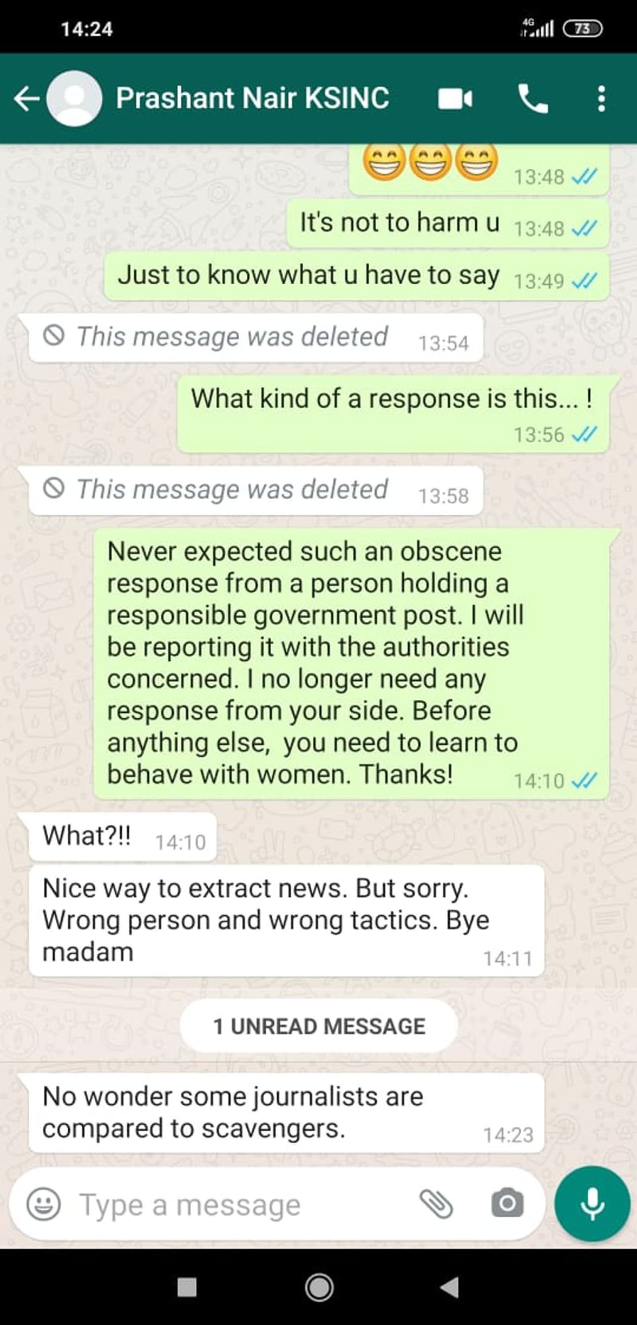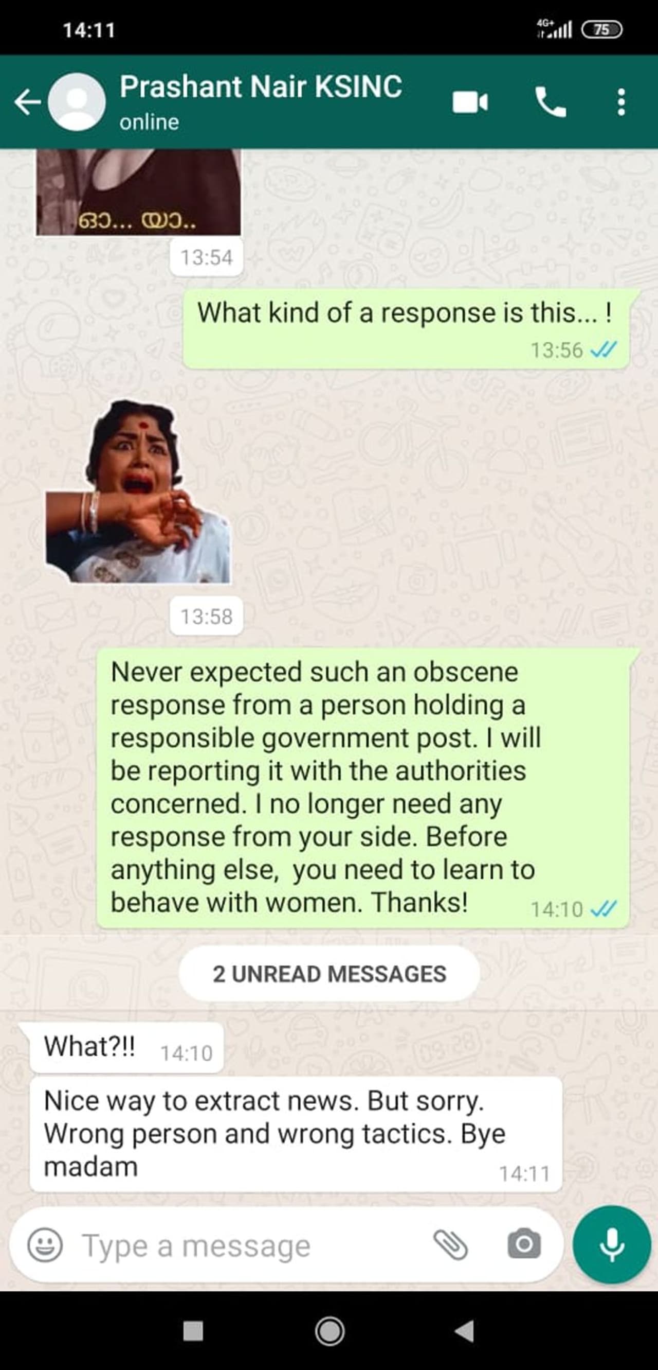 ലേഖിക (2.10) : ഇത്ര അശ്ലീലച്ചുവയുള്ള പ്രതികരണം ഉത്തരവാദിത്തപ്പെട്ട സർക്കാർ പോസ്റ്റിലിരിക്കുന്ന ഒരാളിൽ നിന്ന് ഞാൻ പ്രതീക്ഷിച്ചില്ല. ഇത് ബന്ധപ്പെട്ട അധികാരികൾക്ക് മുന്നിൽ ഞാൻ ഉന്നയിക്കും. എനിക്ക് നിങ്ങളുടെ ഭാഗത്ത് നിന്ന് പ്രതികരണം വേണ്ട. എല്ലാറ്റിനും പുറമേ, നിങ്ങളാദ്യം സ്ത്രീകളോട് പെരുമാറുന്നതെങ്ങനെയെന്ന് പഠിക്കണം. നന്ദി!