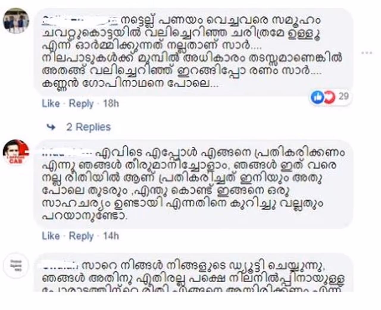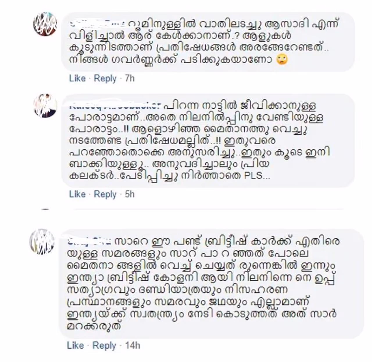 പ്രതിഷേധങ്ങളുടെ സ്വഭാവം കളക്ടര് നിശ്ചയിക്കണ്ടെന്നും ആളുകള് കൂടുന്നിടത്താണ് പ്രതിഷേധങ്ങള് നടത്തേണ്ടതെന്നുമുള്ള തരത്തിലുള്ള കമന്റുകളാണ് കളക്ടറുടെ പോസ്റ്റിന് താഴെയുള്ളത്.
