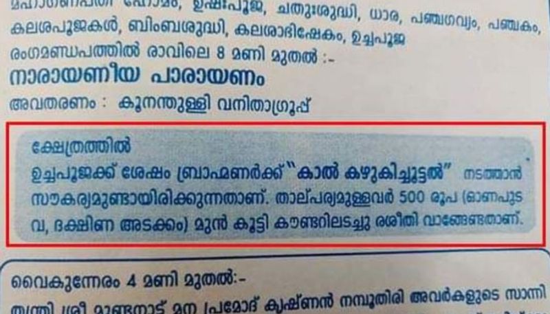 കാൽകഴുകിച്ചൂട്ടും നോട്ടീസും വിവാദമായതോടെ, സമൂഹ മാധ്യമങ്ങളിൽ ചൂടേറിയ ചർച്ചയാണ് നടക്കുന്നത്. വിവാദമായെങ്കിലും പിന്നോട്ടില്ലെന്ന നിലപാടിലാണ് ക്ഷേത്രം ഭാരവാഹികളുളളത്.