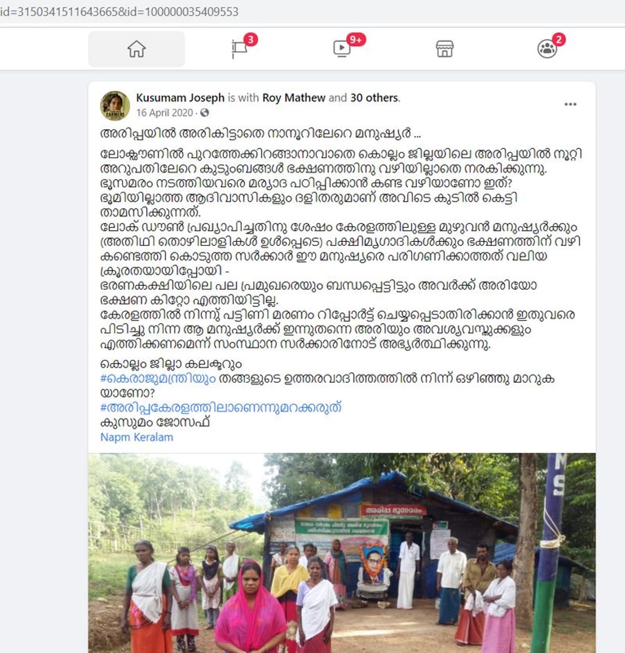 അരിപ്പ സമരഭൂമിയിലുള്ള കുടുംബങ്ങള്ക്ക് ഭക്ഷണത്തിന് വഴിയില്ലെന്നും അരിയോ ഭക്ഷണകിറ്റോ ലഭിച്ചില്ലെന്നും പക്ഷിമൃഗാദികളേയും അതിഥി തൊഴിലാളികളേയും പരിഗണിച്ച സംസ്ഥാന സര്ക്കാര് ഇവരേയും പരിഗണിക്കണമെന്നും ആവശ്യപ്പെട്ടുകൊണ്ട് ലോക്ക്ഡൗണ് കാലത്തിട്ട ഫേസ്ബുക്ക് കുറിപ്പിനെതിരെയാണ് കേസ്