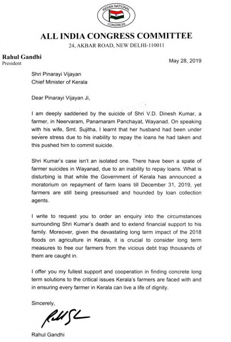 വയനാടിനാടിനായി രാഹുല്; കര്ഷകന്റെ ആത്മഹത്യയില് അന്വേഷണവും സഹായവും ആവശ്യപ്പെട്ട് മുഖ്യമന്ത്രിക്ക് കത്ത്