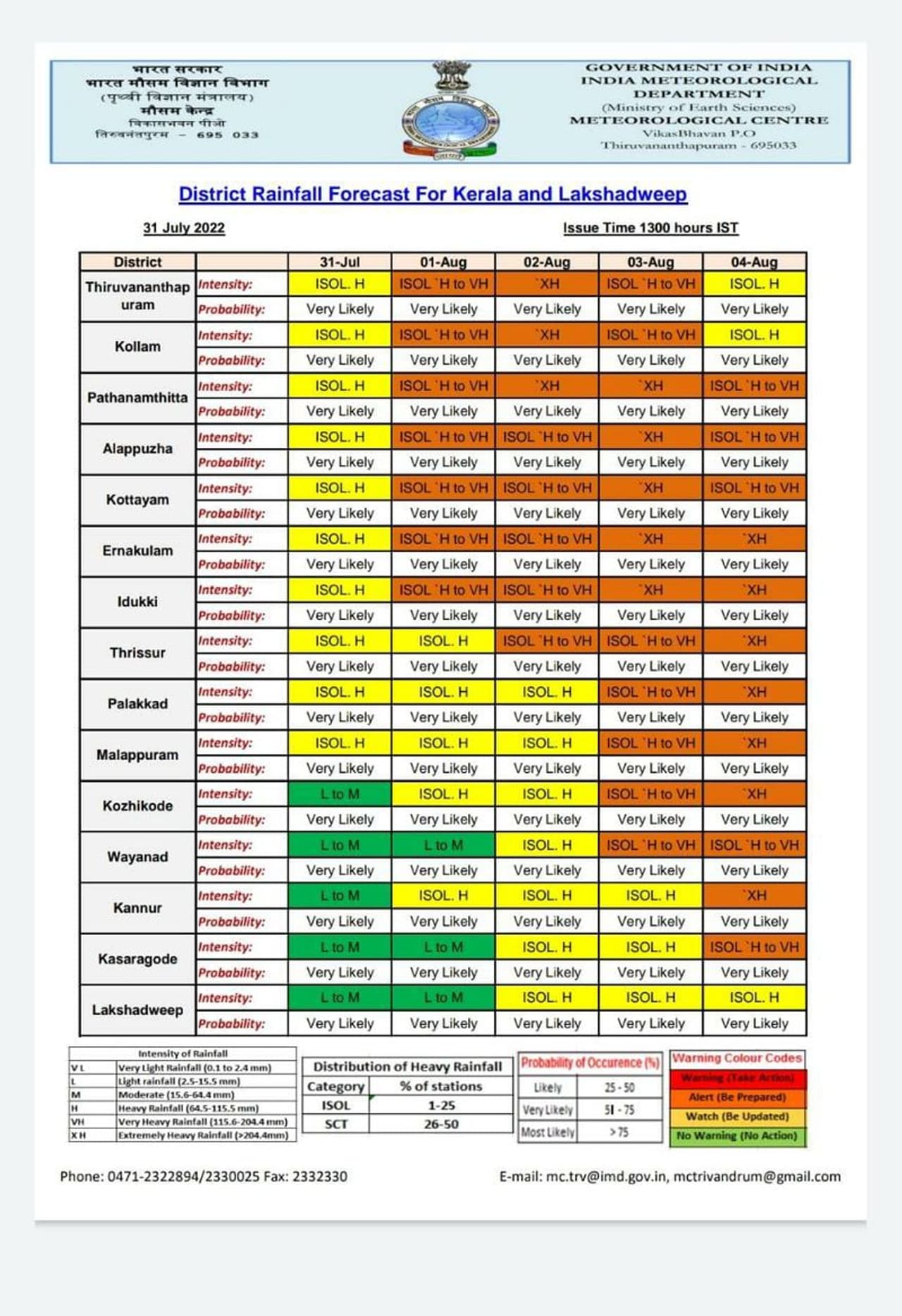 മഴ മുന്നറിയിപ്പിലെ മാറ്റം- ജില്ലാ അടിസ്ഥാനത്തിൽ