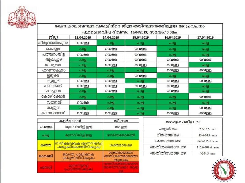 ഏവരും വളരെ പ്രതീക്ഷയോടെ കാത്തിരിക്കുന്നത് വേനല് മഴയെയാണ്. വരും ദിവസങ്ങളില് കാസര്കോട് മുതല് തിരുവനന്തപുരം വരെ മഴയെത്തുമെന്നാണ് കാലാവസ്ഥാ നിരീക്ഷണ കേന്ദ്രം അറിയിച്ചിരിക്കുന്നത്. അതിന്റെ കണക്കും തീവ്രതയും സഹിതമുള്ള പട്ടികയും കാലാവസ്ഥാ വകുപ്പ് പുറത്തിറക്കിയിട്ടുണ്ട്.