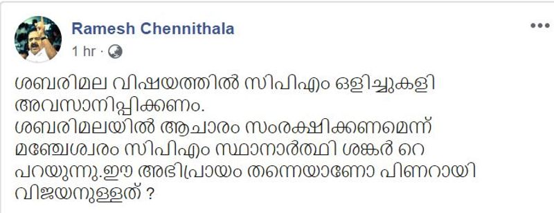 ശബരിമലയിൽ ആചാരം സംരക്ഷിച്ച് യുവതികൾക്കും പ്രവേശിക്കാമെന്ന് മഞ്ചേശ്വരത്തെ ഇടത് മുന്നണി സ്ഥാനാർത്ഥി ശങ്കർ റൈ പ്രതികരിച്ചിരുന്നു. ''ശബരിമലയിൽ വിശ്വാസമുള്ളവർക്ക് അവിടത്തെ ആചാരങ്ങളനുസരിച്ച് പോകാം.അത് പാലിച്ചില്ലെങ്കിൽ ഞാനോ, നിങ്ങളോ, നിങ്ങളുദ്ദേശിക്കുന്ന ആളുകളോ അവിടെ പോകരുതെന്നായിരുന്നു അദ്ദേഹത്തിന്റെ പ്രതികരണം. തുടര്ന്നാണ് ശബരിമല വിഷയത്തിൽ സിപിഎം ഒളിച്ചുകളിക്കുകയാണെന്നും വിഷയത്തില് പിണറായി പ്രതികരിക്കണമെന്നും ആവശ്യപ്പെട്ട് ചെന്നിത്തല രംഗത്തെത്തിയത്.