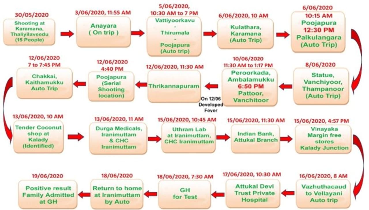 ആശുപത്രിയിൽ അഡ്മിറ്റാവുന്നത് വരെയുള്ള മിക്ക ദിവസങ്ങളിലും ഇയാൾ ഓട്ടോ ഓടിച്ചിട്ടുണ്ട്. 13-ന് ഐറാണിമുറ്റം സാമൂഹികാരോഗ്യകേന്ദ്രത്തിൽ ഇയാൾ എത്തി. പിന്നീട് ആറ്റുകാൽ ഇന്ത്യൻ ബാങ്ക്, കാലടി വിനായക സൂപ്പർ മർക്കറ്റ്, വഴുതക്കാട്, വെള്ളായണി, ആറ്റുകാൽ ദേവി പ്രൈവറ്റ് ഹോസ്പിറ്റൽ എന്നിവിടങ്ങളിലും പോയി.