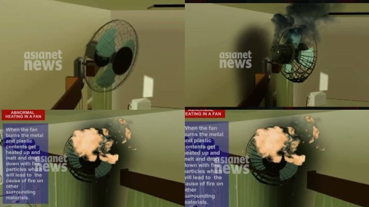 കേടായ ഫാൻ ഓണായതിന് പിന്നാലെ ഫാനിലെ വയറിംഗിൽ താപനില ഉയർന്ന് ട്രിപ്പുണ്ടായി തീപ്പൊരി ഫയലുകളിലേക്കും കർട്ടനുകളിലേക്കും പടർന്നുവെന്നാണ് പൊലീസിൻ്റെ നിഗമനം. ഇതു വ്യക്തമാക്കുന്ന രീതിയിൽ ഒരു ഗ്രാഫിക്സ് വീഡിയോയും പൊലീസ് തയ്യാറാക്കിയിട്ടുണ്ട്. ഈ ഗ്രാഫിക്സ് വീഡിയോയുടെ ദൃശ്യങ്ങൾ ഏഷ്യാനെറ്റ് ന്യൂസിന് ലഭിച്ചു.