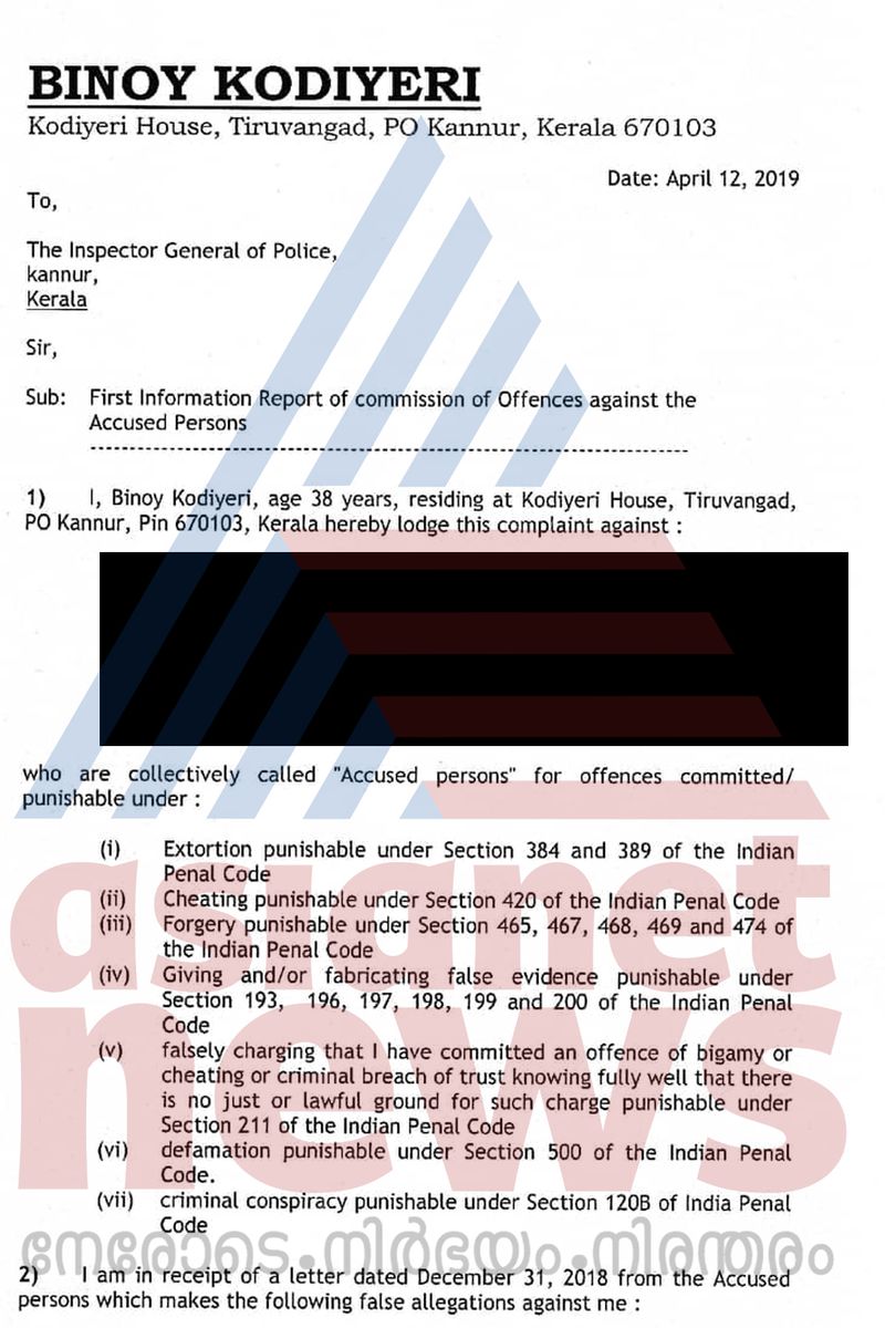 എന്നാല് വിവാഹം കഴിച്ചു എന്നതിന് വ്യാജരേഖയുണ്ടാക്കി എന്നതിന് അടക്കം കേസ് എടുക്കണം എന്ന് ആവശ്യപ്പെട്ടാണ് ബിനോയി 19.4.2018ന് കണ്ണൂര് എസ്പിക്ക് പരാതി നല്കിയിരിക്കുന്നത്. പരാതിയിലെ വിശദാംശങ്ങള് ഇങ്ങനെ, മുപ്പത്തിനാല് വയസുള്ള യുവതിക്കും, മറ്റു ചിലര്ക്കും എതിരെയാണ് പരാതി. പണം തട്ടാനുള്ള ശ്രമം, വ്യാജരേഖ നിര്മ്മാണം, വ്യാജ തെളിവുകള് നിര്മ്മിക്കല്, വ്യക്തിഹത്യ, ഗൂഢാലോചന എന്നീ കുറ്റങ്ങള് ചുമത്തി കേസ് എടുക്കണം എന്നാണ് ബിനോയിയുടെ പരാതിയില് പറയുന്നത്. 31 ഡിസംബര് 2018 ന് യുവതി അയച്ച കത്ത് പ്രകാരം ഒക്ടോബര് 18,2009 ന് ഹിന്ദു വിവാഹ നിയമപ്രകാരം യുവതിയെ വിവാഹം ചെയ്തു എന്ന് ആരോപിക്കുന്നു ഇത് നിഷേധിക്കുന്നതായി ബിനോയി പറയുന്നു.