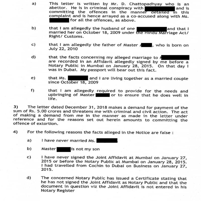 ജൂലൈ 22, 2010ന് യുവതി ബിനോയിയുടെ കുട്ടിക്ക് ജന്മം നല്കി എന്നും അവകാശപ്പെടുന്നു ഈ കാര്യവും ബിനോയി നിഷേധിക്കുന്നു. താന് യുവതിയെ വിവാഹം ചെയ്തെന്ന് തെളിയിക്കുന്ന താന് ഓപ്പിട്ടെന്ന് പറയുന്ന സത്യവാങ്മൂലം കത്തില് ഉള്കൊള്ളിച്ചത് വ്യാജമാണെന്ന് ബിനോയി പൊലീസിനെ അറിയിക്കുന്നുണ്ട്. ഇതിനായി ജനുവരി 28,2015ന് തയ്യാറാക്കിയ ഈ സത്യവാങ്മൂലം തയ്യാറാക്കിയ നോട്ടറിയുടെ നിഷേധകുറിപ്പും ബിനോയി പരാതിക്ക് ഒപ്പം നല്കുന്നുണ്ട്.