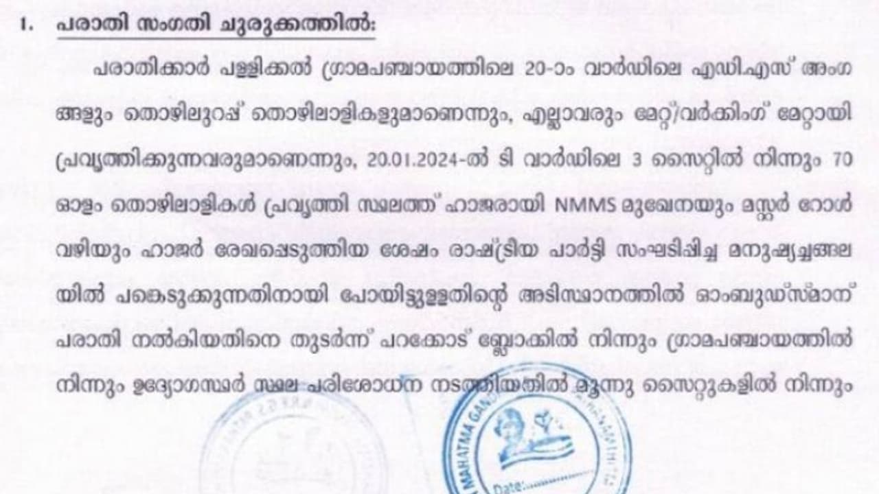തുടർന്ന് ഉദ്യോഗസ്ഥർ നടത്തിയ പരിശോധനയിൽ സംഭവം നടന്നതാണെന്ന് വ്യക്തമായി. എന്നിട്ടും ആരോപണവിധേയരായ മേറ്റുമാരെ ട്രെയിനിംഗിൽ പങ്കെടുപ്പിച്ചെന്നും നിയമപ്രകാരം പ്രവൃത്തി ചെയ്ത തങ്ങളെ ഒഴിവാക്കിയെന്നും ചില മേറ്റുമാർ പരാതി നല്കുകയുണ്ടായി. സിപിഎം ഭരിക്കുന്ന പഞ്ചായത്തിൽ വാർഡ് മെമ്പറുടെ ഇഷ്ടപ്രകാരമാണ് ട്രെയിനിംഗിന് പോകേണ്ട മേറ്റുമാരുടെ പട്ടിക തയ്യാറാക്കിയതെന്നും ഓംബുഡ്സ്മാന് നല്കിയ പരാതിയിലുണ്ട്. പരാതിക്കാർക്ക് മറ്റ് അയോഗ്യതകള് ഒന്നുമില്ലെങ്കിൽ ട്രെയിനിംഗ് നൽകണമെന്ന് പള്ളിക്കൽ പഞ്ചായത്ത് സെക്രട്ടറിക്ക് ഓംബുഡ്സ്മാൻ നിർദേശം നൽകി.