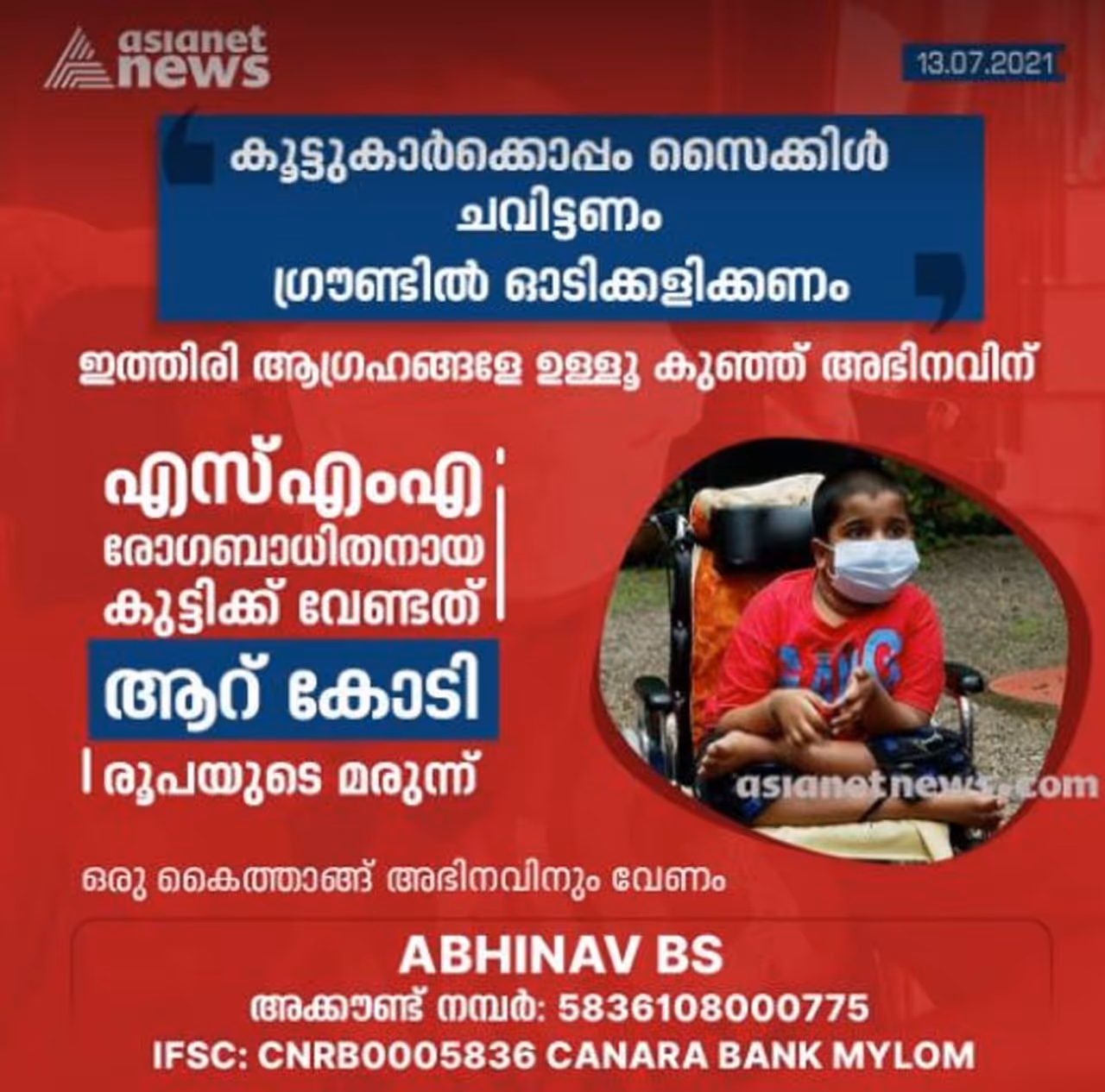 കണ്ണൂരിലെ മുഹമ്മദിനെ പോലെ അഭിനവും നമ്മുടെ പരിഗണന അര്ഹിക്കുന്നുണ്ട്. എസ്എംഎ എന്ന അപൂര്വ രോഗം ബാധിച്ച അഭിനവ് ഉള്പ്പെടെയുളള കുഞ്ഞുങ്ങളുടെ ജീവിക്കാനുളള സ്വപ്നത്തിന് നിറം പകരേണ്ട ഉത്തരവാദിത്തം നമ്മുടെ സര്ക്കാരുകള്ക്കുമുണ്ട്.