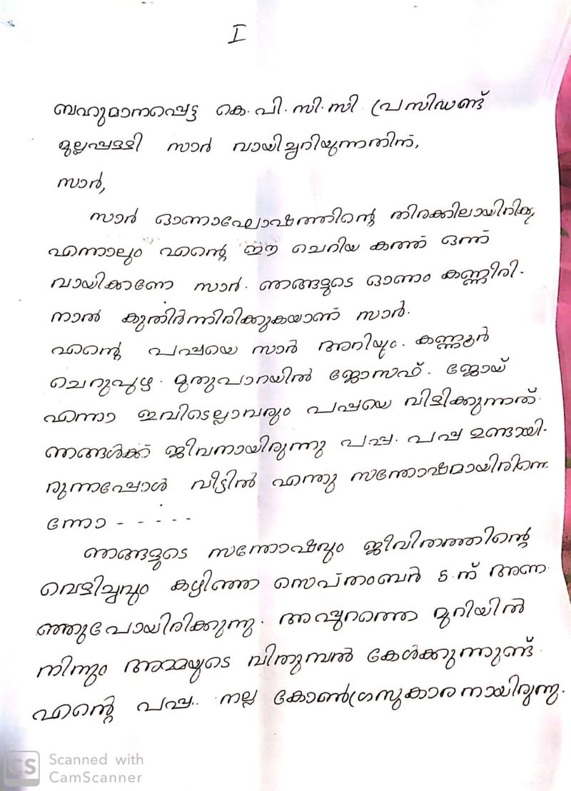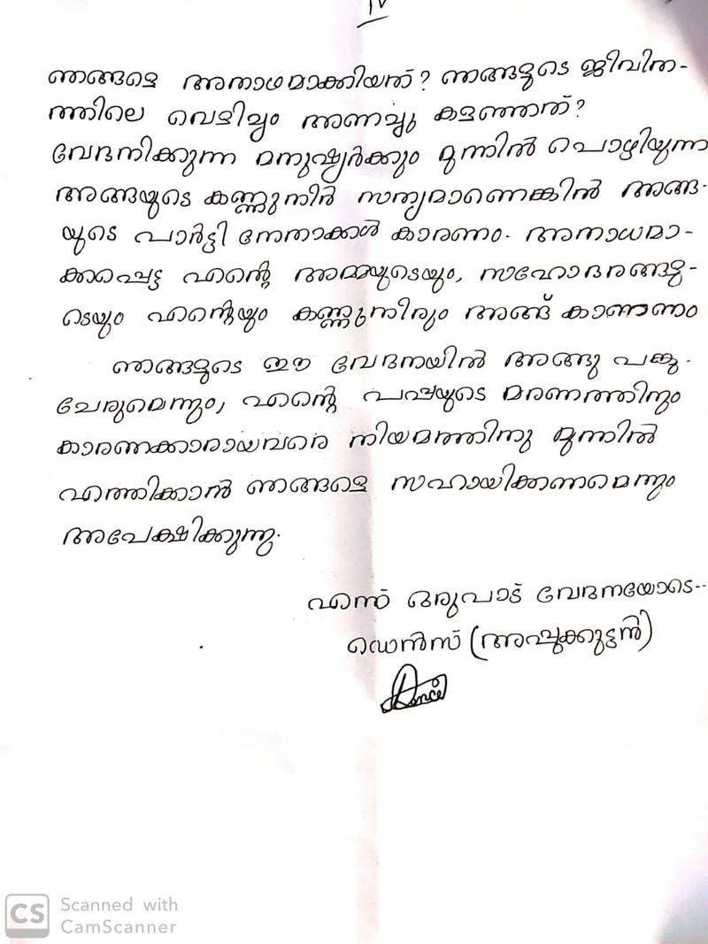 നല്ല കോൺഗ്രസുകാരനായിരുന്ന അച്ഛനെ കോൺഗ്രസുകാർ തന്നെ ചതിച്ച് ഇല്ലാതാക്കിയത് എന്തിനെന്ന് ചോദിക്കുന്ന കത്തിൽ അമ്മയുടെയും തന്റെയും കണ്ണീര് കണ്ട്, നീതിക്കായി ഇടപെടണമെന്ന് ഡെൻസ് ആവശ്യപ്പെടുന്നു.