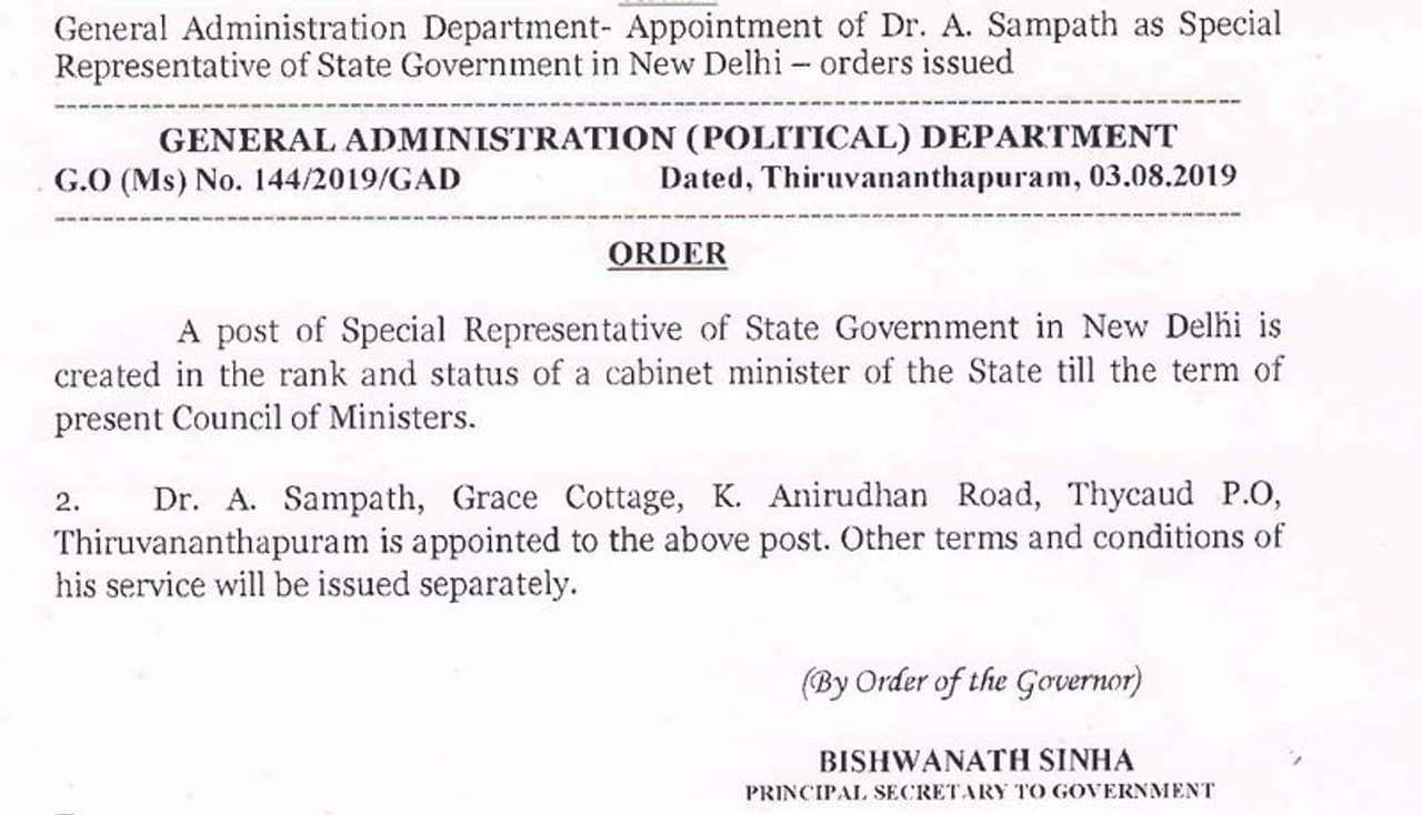 മുൻ എംപി എ സമ്പത്തിന് കാബിനറ്റ് റാങ്കോടെയാണ് ദില്ലിയിൽ സർക്കാർ നിയമനം നൽകിയത്. ദില്ലി കേരള ഹൗസിൽ സംസ്ഥാന സർക്കാറിന്റെ പ്രത്യേക പ്രതിനിധിയായാണ് നിയമനം നൽകിയത്. ഖജനാവിൽ നിന്നും 'സമ്പത്ത്' ചോർത്തുന്ന തീരുമാനമാണിതെന്ന് അന്നേ ആരോപണം ഉയർന്നിരുന്നതാണ്.