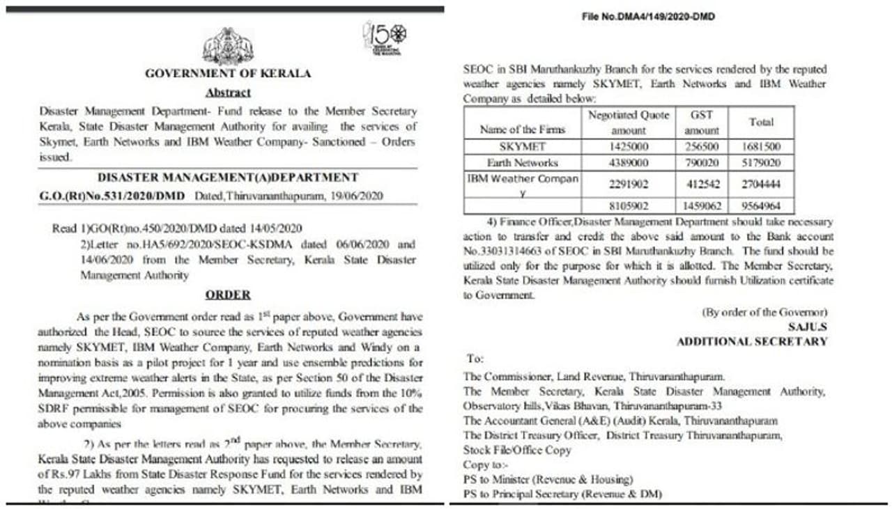 ഒരുവര്ഷത്തേക്ക് 95 ലക്ഷം രൂപയ്ക്കാണ് കരാറിലേര്പ്പെട്ടിരിക്കുന്നത്. ദുരന്ത നിവാരണ ഫണ്ടില് നിന്നാണ് ഇതിനായുള്ള പണം കണ്ടെത്തിയിട്ടുള്ളത്. ജൂണ് 19നാണ് ഇത് സംബന്ധിച്ച ഉത്തരവ് പുറത്തിറങ്ങിയിട്ടുള്ളത്. ഒരു വര്ഷത്തെ പരീക്ഷണ അടിസ്ഥാനത്തിലാണ് ഇതെന്നും ഉത്തരവ് വ്യക്തമാക്കുന്നു. ദുരന്ത നിവാരണ ഫണ്ടിന്റെ പത്ത് ശതമാനം ഇതിനായി മാറ്റിവയ്ക്കുന്നുവെന്നാണ് ഇത് സംബന്ധിച്ച സര്ക്കാര് ഉത്തരവ് വ്യക്തമാക്കുന്നത്. പ്രളയകാലത്ത് കേന്ദ്ര കാലാവസ്ഥ വകുപ്പുമായുണ്ടായ തര്ക്കങ്ങളെ തുടര്ന്നാണ് സംസ്ഥാന സര്ക്കാരിന്റെ തീരുമാനമെന്നാണ് സൂചന. ഓഖി ചുഴലിക്കാറ്റിന് പിന്നാലെ മുന്നറിയിപ്പുകള് കൃത്യമായി നല്കുന്നതില് വീഴ്ചയുണ്ടായെന്നും നല്കിയ മുന്നറിയിപ്പുകള് പരിഗണിച്ചില്ലെന്നുമുള്ള കാലവസ്ഥാ വകുപ്പും സംസ്ഥാന സര്ക്കാരും തമ്മിലുള്ള തര്ക്കം ഏറെ വിവാദമായിരുന്നു.