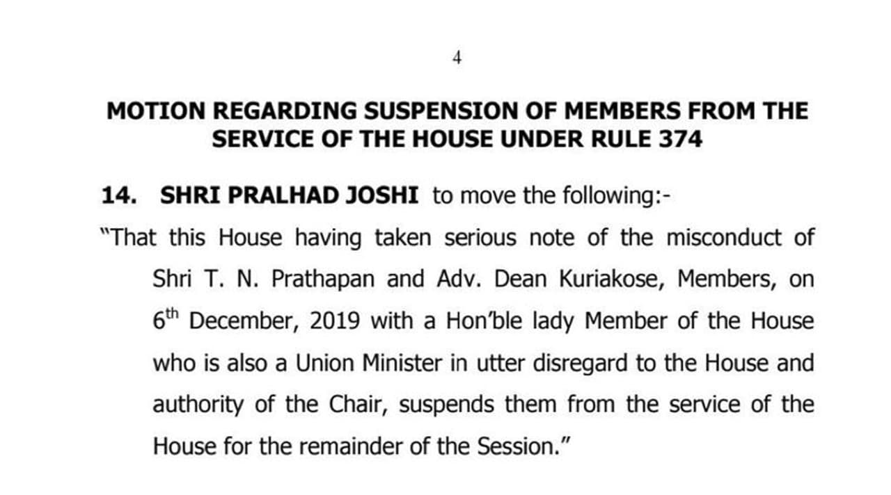 ടിഎൻ പ്രതാപനും ഡീൻ കുര്യക്കോസും തന്നെ ഭീഷണിപ്പെടുത്തിയെന്നും അപമാനിച്ചെന്നും സ്മൃതി ഇറാനി ആരോപിച്ചത് സഭയെ പ്രക്ഷുബ്ധമാക്കിയിരുന്നു