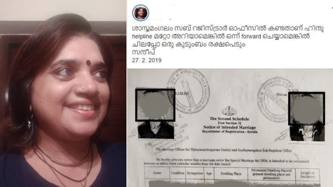 തിരുവനന്തപുരം: സ്പെഷ്യൽ മാര്യേജ് ആക്ട് പ്രകാരം ഒരുമിക്കാൻ തീരുമാനിച്ച യുവതീയുവാക്കളുടെ വിവാഹം ടെലിവിഷൻ അവതാരകയായ ശ്രീജ നായർ തടയാൻ ശ്രമിച്ചത് വിവാദമായി. രണ്ട് മതവിഭാഗങ്ങളിൽപ്പെട്ട യുവതീയുവാക്കളുടെ വിവാഹം ഫേസ്ബുക്ക് പോസ്റ്റിലൂടെയാണ് ശ്രീജ നായർ തടസപ്പെടുത്താൻ ശ്രമിച്ചത്. വിവാഹിതരാകാൻ തീരുമാനിച്ച ചെറുപ്പക്കാരുടെ ചിത്രങ്ങളും വിലാസവും അടങ്ങിയ നോട്ടീസ് സബ് രജിസ്ട്രാർ ഓഫീസിൽ പതിച്ചിരുന്നു. ഈ നോട്ടീസിന്റെ പകർപ്പ് ഫേസ്ബുക്കിൽ പോസ്റ്റ് ചെയ്തതിന് ശേഷം ഹിന്ദു ഹെൽപ്ലൈൻ എന്ന സംഘടനയെ വിവാഹ വിവരം അറിയിക്കണമെന്നും ശ്രീജ നായർ ആഹ്വാനം ചെയ്തു. അങ്ങനെ ചെയ്താൽ ചിലപ്പോൾ ഒരു കുടുംബം രക്ഷപ്പെടും എന്നായിരുന്നു ശ്രീജയുടെ കുറിപ്പ്. സന്ദീപ് എന്നൊരാളുടെ ഫേസ്ബുക്ക് സ്റ്റാറ്റസ് ഇവർ പകർത്തുകയായിരുന്നു എന്നാണ് സൂചന.