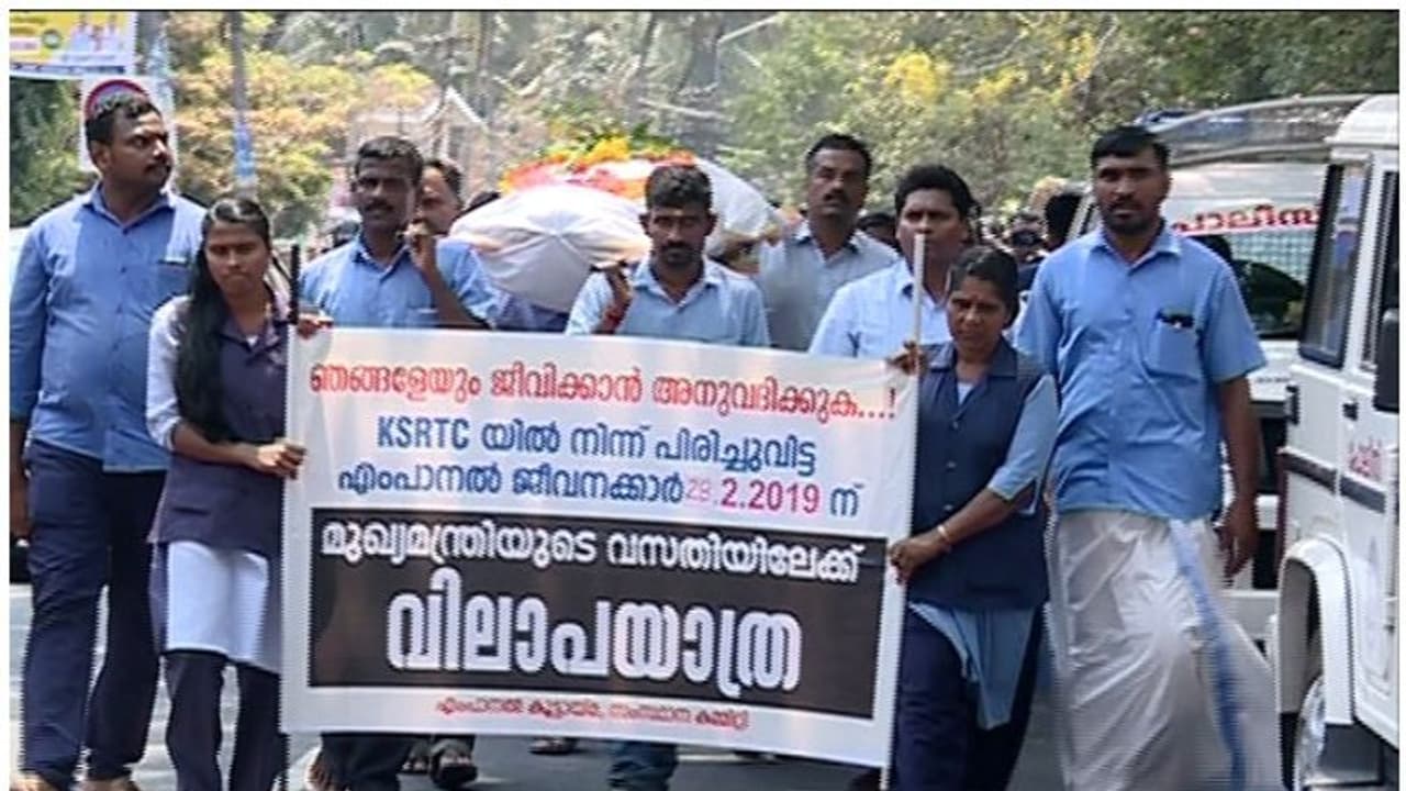 തിരുവനന്തപുരം: സെക്രട്ടറിയേറ്റിന് മുന്നിൽ അനിശ്ചിതകാല സമരം നടത്തിവരുന്ന താത്കാലിക കണ്ടക്ടർമാർ ക്ലിഫ് ഹൗസിലേക്ക് വിലാപ യാത്ര നടത്തി. ഇടതുമുന്നണി കണ്വീനറും ഗതാഗതമന്ത്രിയും നൽകിയ ഉറപ്പുകള് പാലക്കാത്തിനെ തുടർന്നാണ് ക്ലിഫ് ഹൗസിലേക്ക് മാർച്ച് നടത്തുന്നതെന്ന് സമരസമതി പറഞ്ഞു.