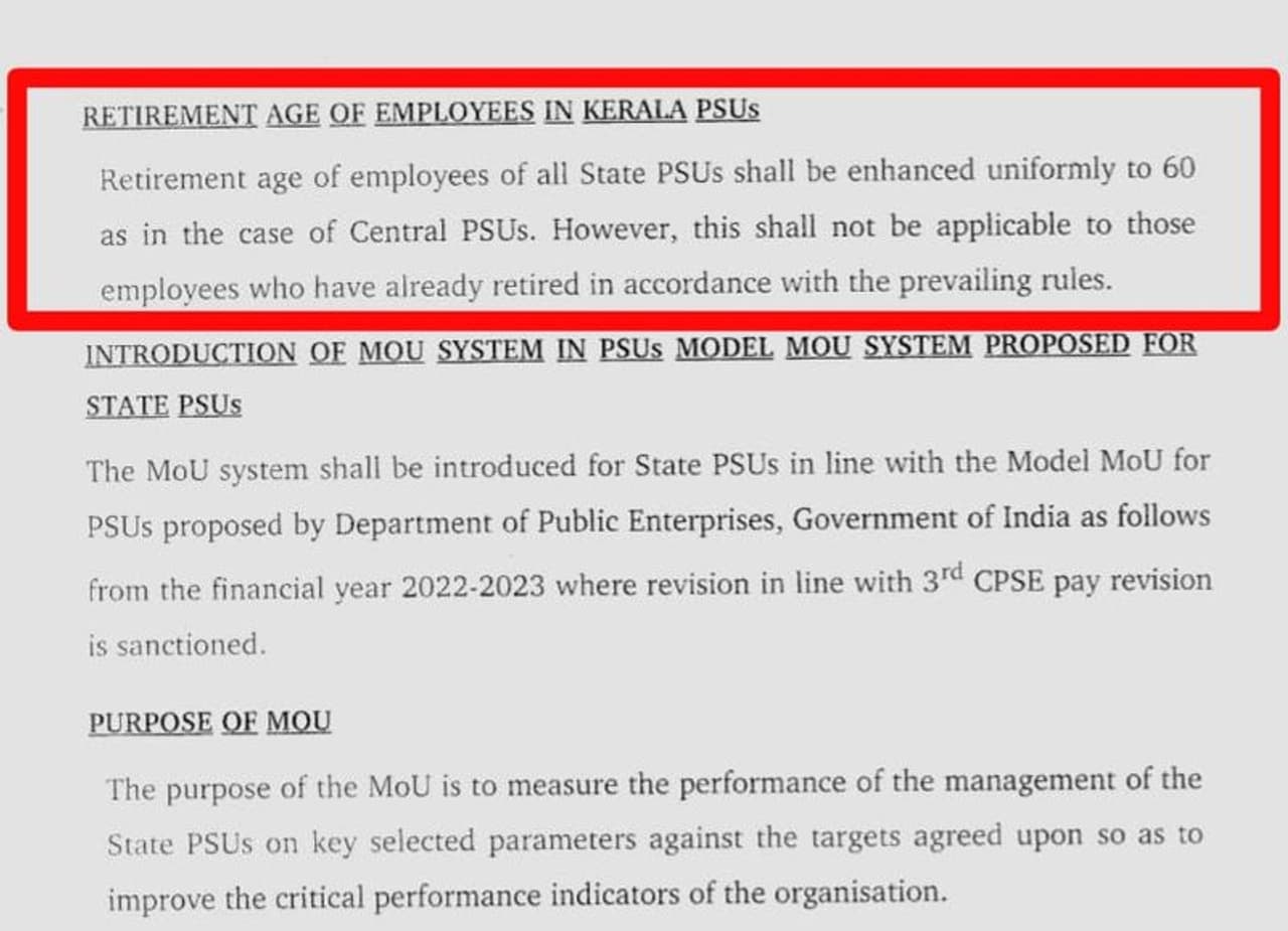 കെ എസ് ഇബി, കെഎസ്ആര്ടിസി, വാട്ടർ അതോറിറ്റി ഒഴികെയുള്ള പൊതുമേഖലസ്ഥാപനങ്ങളിലെ പെന്ഷന് പ്രായമാണ് ഏകീകരിച്ചത്.: ഈ മൂന്നു സ്ഥാപനങ്ങളിലെയും പെൻഷൻ പ്രായം കൂട്ടുന്നത് പ്രത്യേകം പഠിക്കും