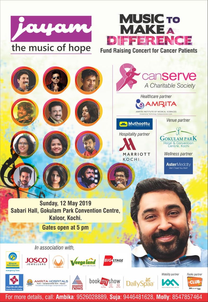 ക്യാൻസർ രോഗികൾക്കായുള്ള ധനശേഖരണാർത്ഥം 'കാൻസെർവ്' സൊസൈറ്റി നടത്തുന്ന സംഗീത നിശ മെയ് 12ന് വൈകീട്ട് 5ന് ഗോകുലം കൺവെൻഷൻ സെൻ്ററിലെ ശബരി ഹാളിൽ നടക്കും. 'ജയം - മ്യൂസിക് ഓഫ് ഹോപ്പ്' എന്നു പേരിട്ടിരിക്കുന്ന സംഗീതപരിപാടിയിൽ എം.ജയചന്ദ്രൻ, ഉണ്ണിമേനോൻ, സ്റ്റീഫൻ ദേവസ്സി, സിതാര, ഹരിചരൺ, കാർത്തിക്, ശബരീഷ്, അജയ ഗോപാൽ, സുദീപ് കുമാർ, ഹരിശങ്കർ, നിഖിൽ, രാജലക്ഷ്മി, ശ്രേയ ജയദീപ് തുടങ്ങിയ പ്രമുഖതാരങ്ങളാണ് അണിനിരക്കുന്നത്.
