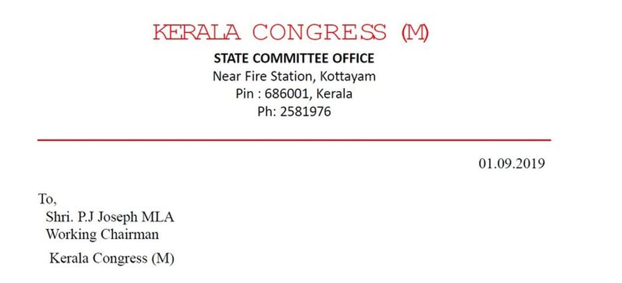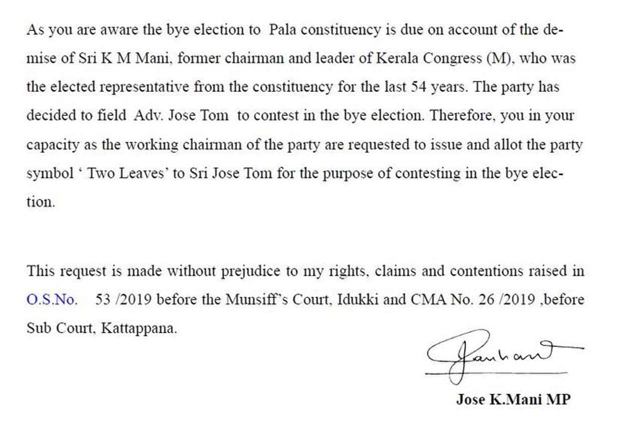 അതേസമയം, പത്രിക നൽകേണ്ട അവസാനദിവസമായിരുന്ന ഇന്നലെ ഉച്ചയ്ക്ക് രണ്ടിലച്ചിഹ്നം ആവശ്യപ്പെട്ട് പി ജെ ജോസഫിന് ജോസ് കെ മാണി അയച്ച ഒരു കത്ത് പുറത്തു വന്നു. കത്തിലെ തീയതി സെപ്റ്റംബർ 1 എന്നാണ് രേഖപ്പെടുത്തിയിരിക്കുന്നത്. എന്നാൽ ഇന്നലെ ഉച്ചയ്ക്ക് മാത്രമാണ് കത്ത് കിട്ടിയതെന്നാണ് ജോസഫ് പക്ഷം പറയുന്നത്. പാലാ ഉപതെരഞ്ഞെടുപ്പിൽ യുഡിഎഫ് സ്ഥാനാർത്ഥിയായി ജോസ് ടോം പുലിക്കുന്നേലിനെ തെരഞ്ഞെടുത്തിരിക്കുന്നതിനാൽ ചിഹ്നം അദ്ദേഹത്തിന് അനുവദിക്കണമെന്നാവശ്യപ്പെട്ടാണ് കത്ത്. എന്നാൽ തൊടുപുഴ മുൻസിഫ് കോടതിയിൽ ഇതുമായി ബന്ധപ്പെട്ട് നടക്കുന്ന കേസിലേക്ക് ഈ കത്തിനെയും ചിഹ്നം അനുവദിക്കുന്ന നടപടിയെയോ ബന്ധപ്പെടുത്തരുതെന്നും കത്തിൽ ആവശ്യമുണ്ട്.