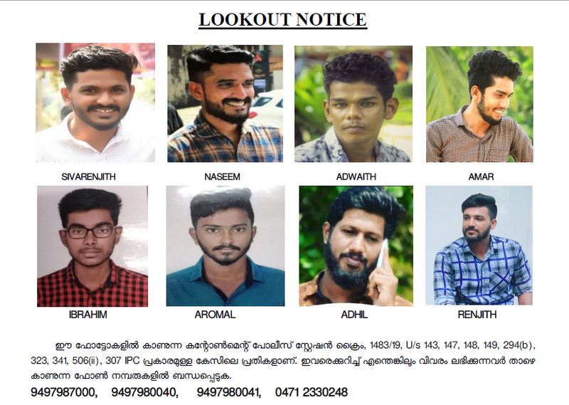 തിരുവനന്തപുരം: യൂണിവേഴ്സിറ്റി കോളേജിൽ വിദ്യാർത്ഥി അഖിലിനെ കുത്തിയ കേസിൽ എട്ട് പ്രതികൾക്കെതിരെ ലുക്കൗട്ട് നോട്ടീസിറങ്ങി. ഒന്നാം പ്രതി ശിവരഞ്ജിത്, രണ്ടാം പ്രതി നസീം, മൂന്നാം പ്രതി അദ്വൈത്, നാലാം പ്രതി അമർ, അഞ്ചാം പ്രതി ഇബ്രാഹിം, ആറാം പ്രതി ആരോമൽ, ഏഴാം പ്രതി ആദിൽ, എട്ടാം പ്രതി രഞ്ജിത്ത് എന്നിവർക്കെതിരെയാണ് ലുക്കൗട്ട് നോട്ടീസിറക്കിയത്.
