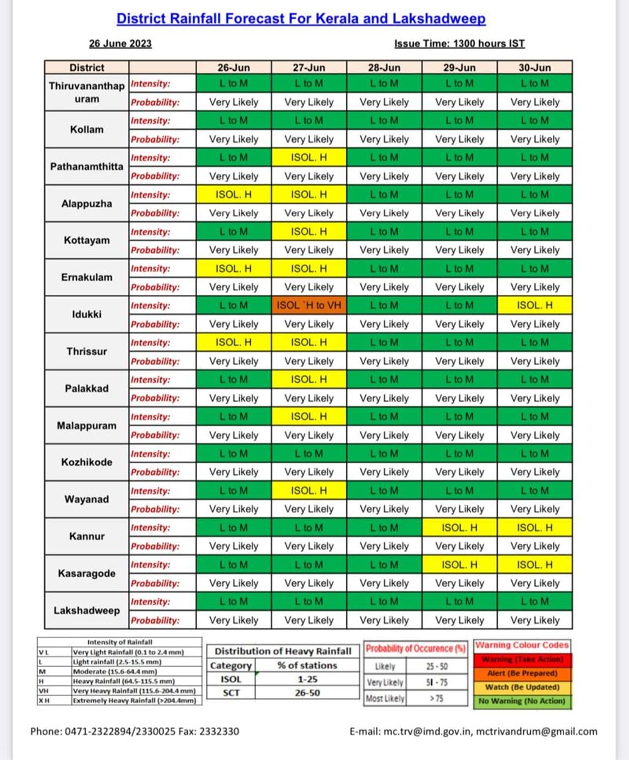 കേരളത്തിൽ അടുത്ത 5 ദിവസം വ്യാപകമായ മഴയ്ക്ക് സാധ്യതയുണ്ടെന്ന് കേന്ദ്ര കാലാവസ്ഥാ വിഭാഗവും മുന്നറിയിപ്പ് നൽകിയിട്ടുണ്ട്. ഇന്നും നാളെയും ഒറ്റപ്പെട്ട സ്ഥലങ്ങളിൽ ശക്തമായ മഴയ്ക്കും. നാളെ( ജൂൺ 27 ) ഒറ്റപ്പെട്ട സ്ഥലങ്ങളിൽ അതിശക്തമായ മഴയ്ക്കും സാധ്യതയുണ്ടെന്നാണ് കേന്ദ്ര കാലാവസ്ഥ വകുപ്പ് അറിയിക്കുന്നത്. വടക്ക് - പടിഞ്ഞാറൻ ബംഗാൾ ഉൾകടലിൽ, വടക്കൻ ഒഡിഷ - പശ്ചിമ ബംഗാൾ തീരത്തിനു സമീപം രൂപപ്പെട്ട ന്യുനമർദ്ദം നിലവിൽ വടക്കൻ ഒഡിഷയ്ക്ക് മുകളിലായാണ് സ്ഥിതി ചെയ്യുന്നത്. ഇത് അടുത്ത രണ്ടു ദിവസം ജാർഖണ്ഡ്, ഛത്തിസ്ഖണ്ഡ് വഴി വടക്കൻ മധ്യപ്രദേശിലേക്ക് നീങ്ങാൻ സാധ്യതയുണ്ട്.